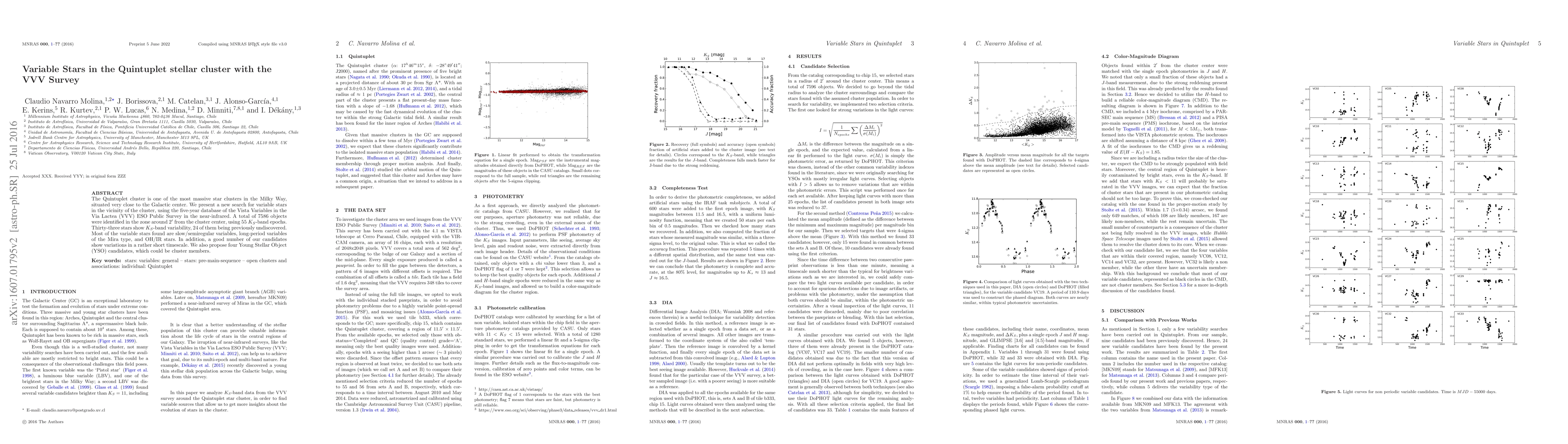 The VVV Survey identified 33 variable stars near the Quintuplet cluster, with 24 being previously undiscovered. Most are slow/semiregular, Mira-type, or OH/IR stars, and some show short-term variations; four Young Stellar Objects are also proposed as potential cluster members.