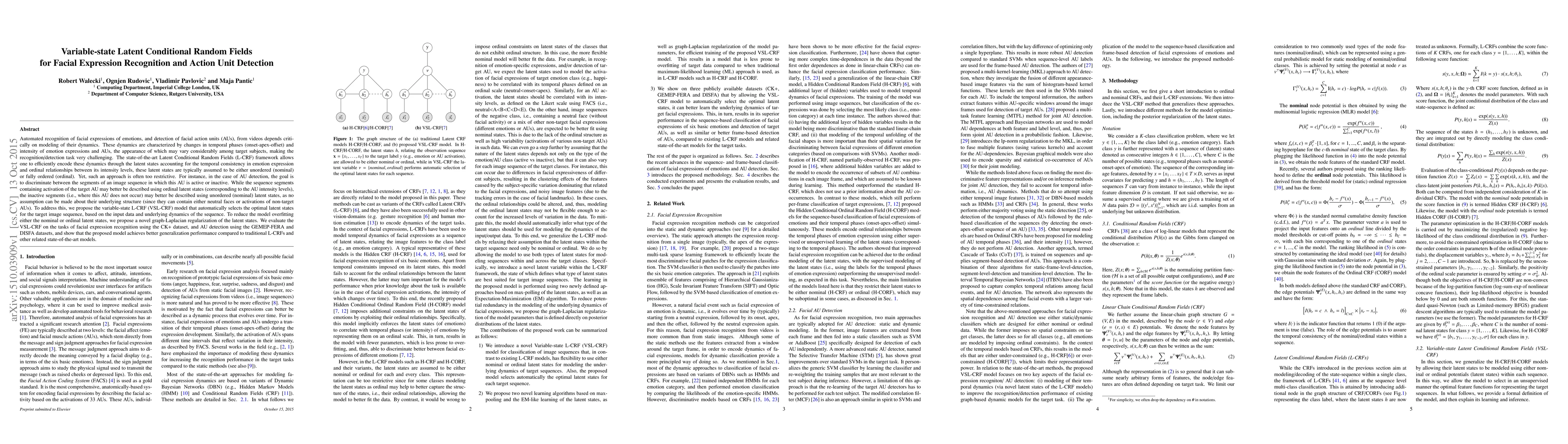 The paper proposes a variable-state Latent Conditional Random Fields (VSL-CRF) model for improved facial expression recognition and action unit detection by dynamically selecting optimal latent states. It introduces a graph-Laplacian regularization to prevent overfitting, achieving better generalization performance on public datasets compared to traditional L-CRF models.