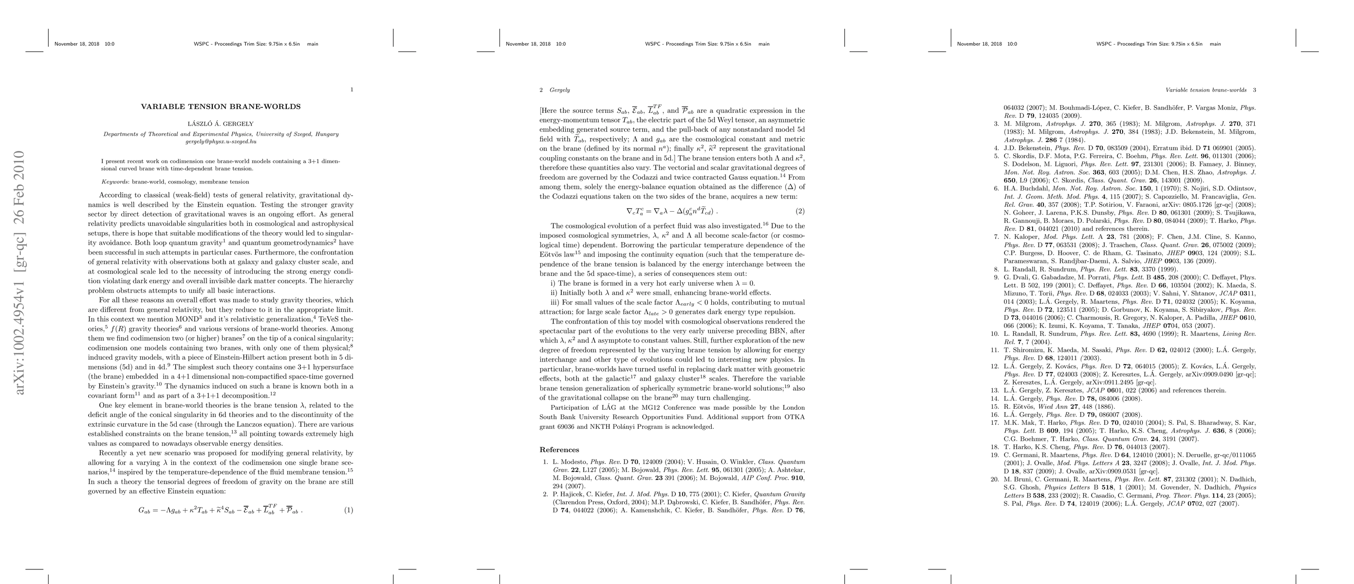 Summary: This paper explores codimension one brane-world models featuring a 3+1 dimensional curved brane with variable tension over time, investigating its implications for the dynamics and geometry of the brane.