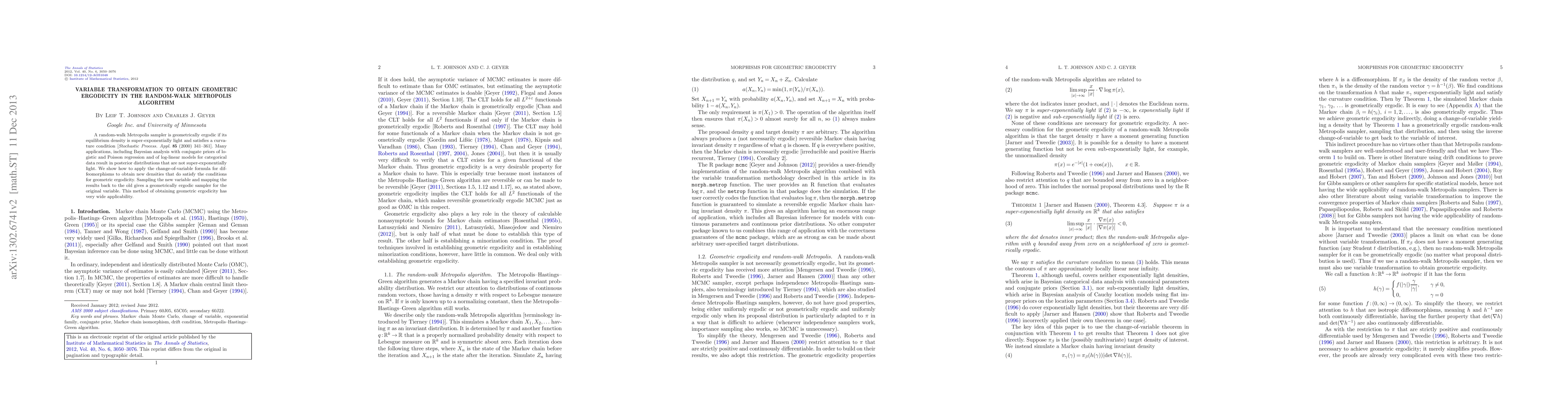 A random-walk Metropolis sampler is geometrically ergodic if its equilibrium density is super-exponentially light and satisfies a curvature condition [Stochastic Process. Appl. 85 (2000) 341-361]. Many applications, including Bayesian analysis with conjugate priors of logistic and Poisson regression and of log-linear models for categorical data result in posterior distributions that are not super-exponentially light. We show how to apply the change-of-variable formula for diffeomorphisms to obtain new densities that do satisfy the conditions for geometric ergodicity. Sampling the new variable and mapping the results back to the old gives a geometrically ergodic sampler for the original variable. This method of obtaining geometric ergodicity has very wide applicability.