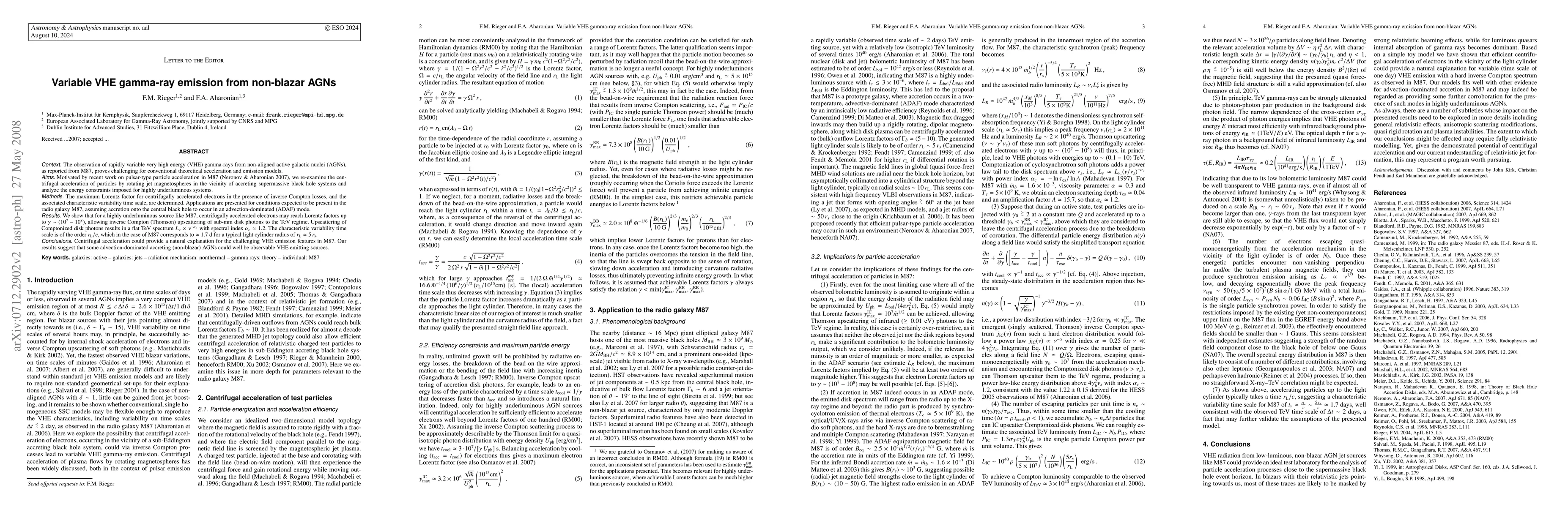The observation of rapidly variable very high energy (VHE) gamma-rays from non-aligned active galactic nuclei (AGNs), as reported from M87, proves challenging for conventional theoretical acceleration and emission models. We re-examine the centrifugal acceleration of particles by rotating jet magnetospheres in the vicinity of accreting supermassive black hole systems and analyze the energy constraints imposed for highly underluminous systems. Applications are presented for conditions expected to be present in the radio galaxy M87, assuming accretion onto the central black hole to occur in an advection-dominated (ADAF) mode. We show that for a highly underluminous source like M87, centrifugally accelerated electrons may reach Lorentz factors up to $\gamma \sim (10^7-10^8)$, allowing inverse Compton (Thomson) upscattering of sub-mm disk photons to the TeV regime. Upscattering of Comptonized disk photons results in a flat TeV spectrum $L_{\nu} \propto \nu^{-\alpha_c}$ with spectral index $\alpha_c \simeq 1.2$. The characteristic variability time scale is of the order $r_{\rm L}/c$, which in the case of M87 corresponds to $\simeq 1.7$ d for a typical light cylinder radius of $r_{\rm L} \simeq 5 r_{\rm s}$. Centrifugal acceleration could thus provide a natural explanation for the challenging VHE emission features in M87. Our results suggest that some advection-dominated accreting (non-blazar) AGNs could well be observable VHE emitting sources. (abridged)