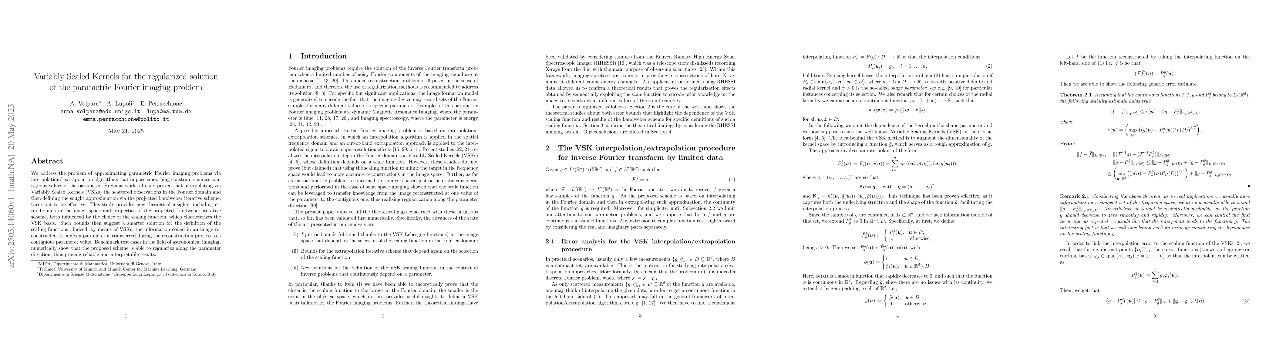The research employs Variably Scaled Kernels (VSKs) for approximating parametric Fourier imaging problems, utilizing interpolation/extrapolation algorithms with smoothing constraints across parameter values and the projected Landweber iterative scheme.
