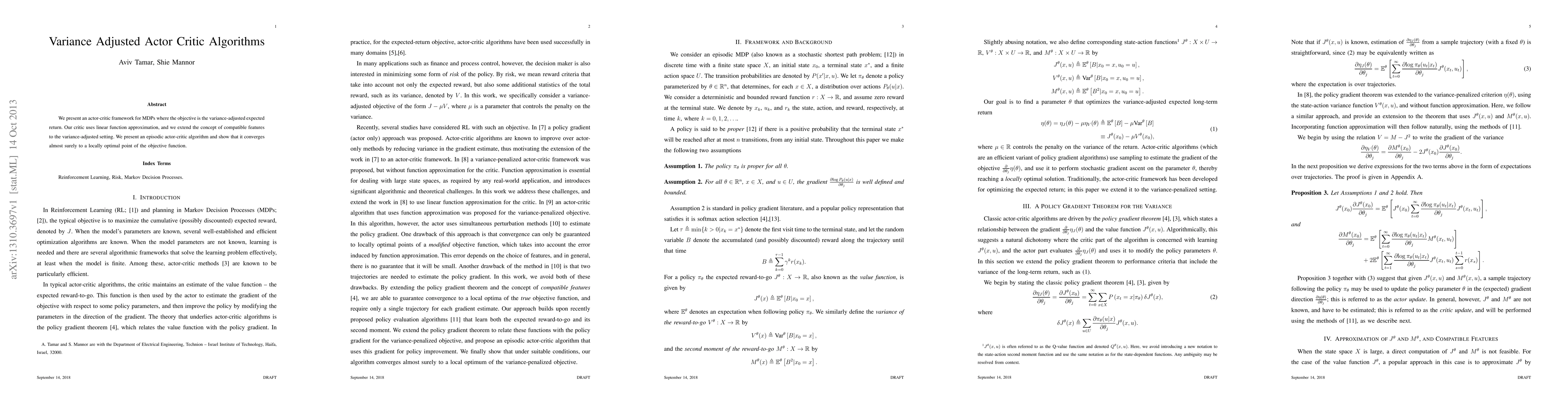 Researchers develop an actor-critic algorithm for Markov Decision Processes (MDPs) that maximizes variance-adjusted expected return, showing convergence to a locally optimal solution.