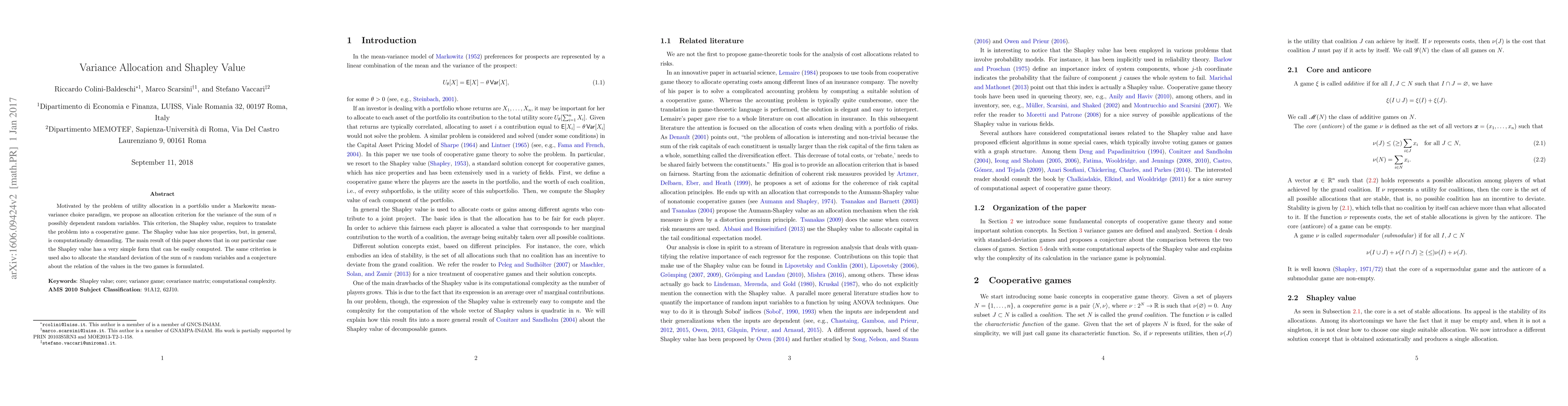 This paper proposes using the Shapley value for allocating variance in a portfolio under the Markowitz mean-variance model, translating it into a cooperative game framework. The authors demonstrate that the Shapley value simplifies significantly in this context, allowing for easy computation.
