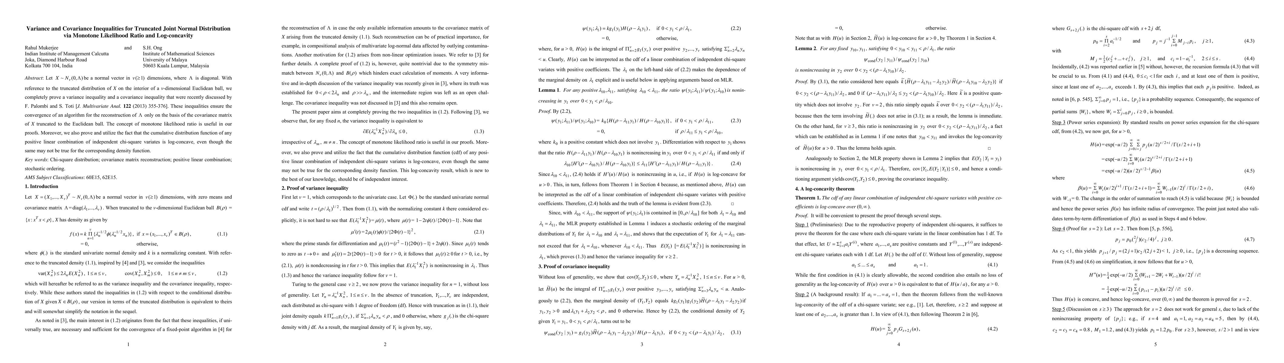 Let X Nv(0, {\Lambda}) be a normal vector in v dimensions, where {\Lambda} is diagonal. With reference to the truncated distribution of X on the interior of a v-dimensional Euclidean ball, we completely prove a variance inequality and a covariance inequality that were recently discussed by F. Palombi and S. Toti [J. Multivariate Anal. 122 (2013) 355-376]. These inequalities ensure the convergence of an algorithm for the reconstruction of {\Lambda} only on the basis of the covariance matrix of X truncated to the Euclidean ball. The concept of monotone likelihood ratio is useful in our proofs. Moreover, we also prove and utilize the fact that the cumulative distribution function of any positive linear combination of independent chi-square variates is log-concave, even though the same may not be true for the corresponding density function.