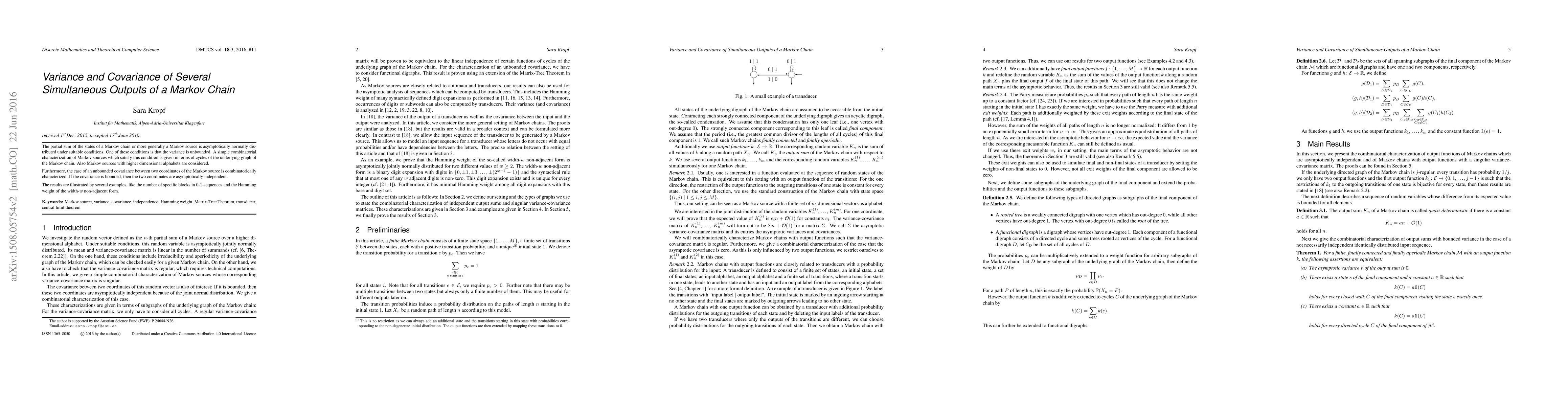 The partial sum of the states of a Markov chain or more generally a Markov source is asymptotically normally distributed under suitable conditions. One of these conditions is that the variance is unbounded. A simple combinatorial characterization of Markov sources which satisfy this condition is given in terms of cycles of the underlying graph of the Markov chain. Also Markov sources with higher dimensional alphabets are considered. Furthermore, the case of an unbounded covariance between two coordinates of the Markov source is combinatorically characterized. If the covariance is bounded, then the two coordinates are asymptotically independent. The results are illustrated by several examples, like the number of specific blocks in $0$-$1$-sequences and the Hamming weight of the width-$w$ non-adjacent form.