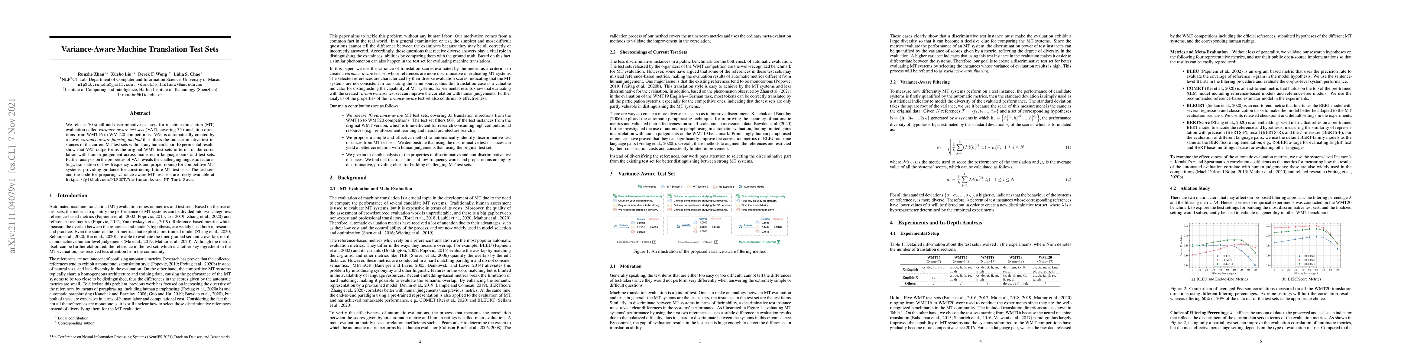 The paper presents a variance-aware filtering method that automatically creates discriminative MT test sets by filtering indiscriminative instances from existing test sets, without human intervention.