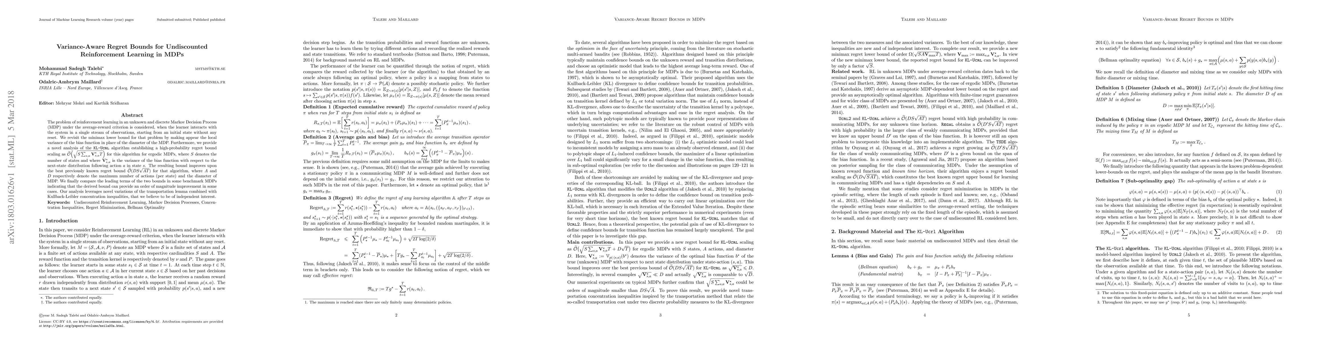 This paper presents improved variance-aware regret bounds for undiscounted reinforcement learning in MDPs, focusing on the KL-UCRL algorithm. It establishes a high-probability regret bound that scales with the variance of the bias function, outperforming previous bounds by leveraging novel variations of the transportation lemma and Kullback-Leibler concentration inequalities.