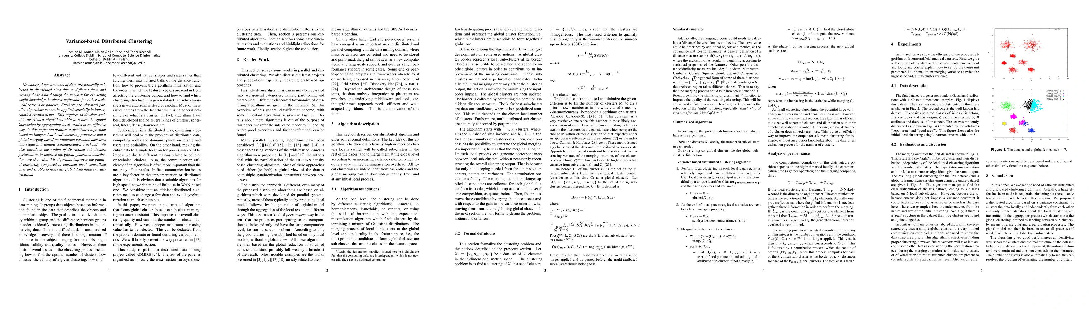 This paper presents a distributed clustering algorithm for handling large, naturally distributed datasets. It proposes a method using local clustering processes and a global merging strategy based on minimum variance increases, reducing communication overhead. The approach improves clustering quality over local centralized methods and effectively reveals the true global data distribution.