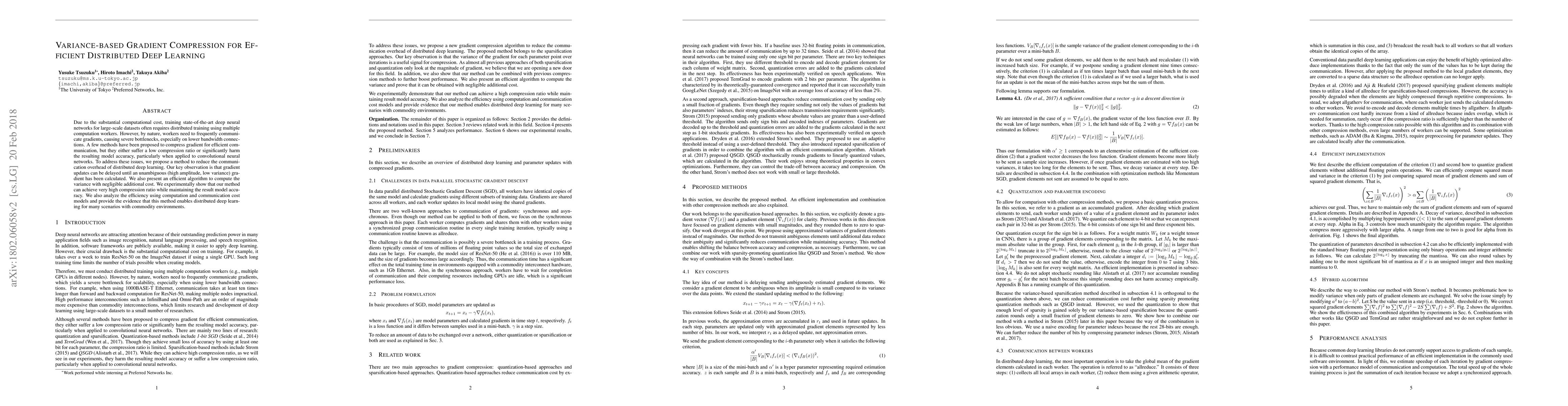 Due to the substantial computational cost, training state-of-the-art deep neural networks for large-scale datasets often requires distributed training using multiple computation workers. However, by nature, workers need to frequently communicate gradients, causing severe bottlenecks, especially on lower bandwidth connections. A few methods have been proposed to compress gradient for efficient communication, but they either suffer a low compression ratio or significantly harm the resulting model accuracy, particularly when applied to convolutional neural networks. To address these issues, we propose a method to reduce the communication overhead of distributed deep learning. Our key observation is that gradient updates can be delayed until an unambiguous (high amplitude, low variance) gradient has been calculated. We also present an efficient algorithm to compute the variance with negligible additional cost. We experimentally show that our method can achieve very high compression ratio while maintaining the result model accuracy. We also analyze the efficiency using computation and communication cost models and provide the evidence that this method enables distributed deep learning for many scenarios with commodity environments.