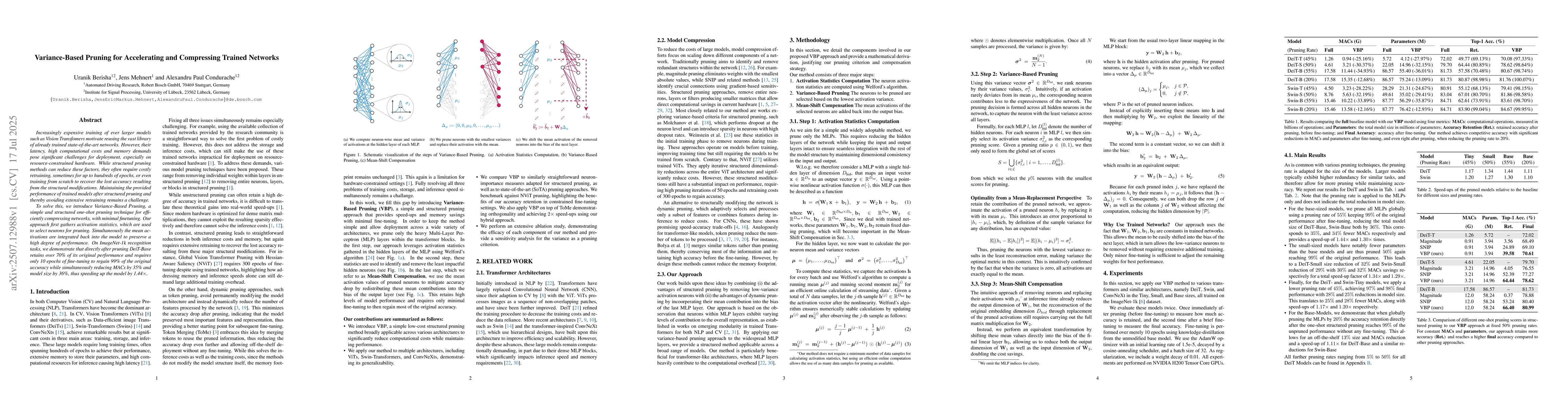 Increasingly expensive training of ever larger models such as Vision Transfomers motivate reusing the vast library of already trained state-of-the-art networks. However, their latency, high computational costs and memory demands pose significant challenges for deployment, especially on resource-constrained hardware. While structured pruning methods can reduce these factors, they often require costly retraining, sometimes for up to hundreds of epochs, or even training from scratch to recover the lost accuracy resulting from the structural modifications. Maintaining the provided performance of trained models after structured pruning and thereby avoiding extensive retraining remains a challenge. To solve this, we introduce Variance-Based Pruning, a simple and structured one-shot pruning technique for efficiently compressing networks, with minimal finetuning. Our approach first gathers activation statistics, which are used to select neurons for pruning. Simultaneously the mean activations are integrated back into the model to preserve a high degree of performance. On ImageNet-1k recognition tasks, we demonstrate that directly after pruning DeiT-Base retains over 70% of its original performance and requires only 10 epochs of fine-tuning to regain 99% of the original accuracy while simultaneously reducing MACs by 35% and model size by 36%, thus speeding up the model by 1.44x.