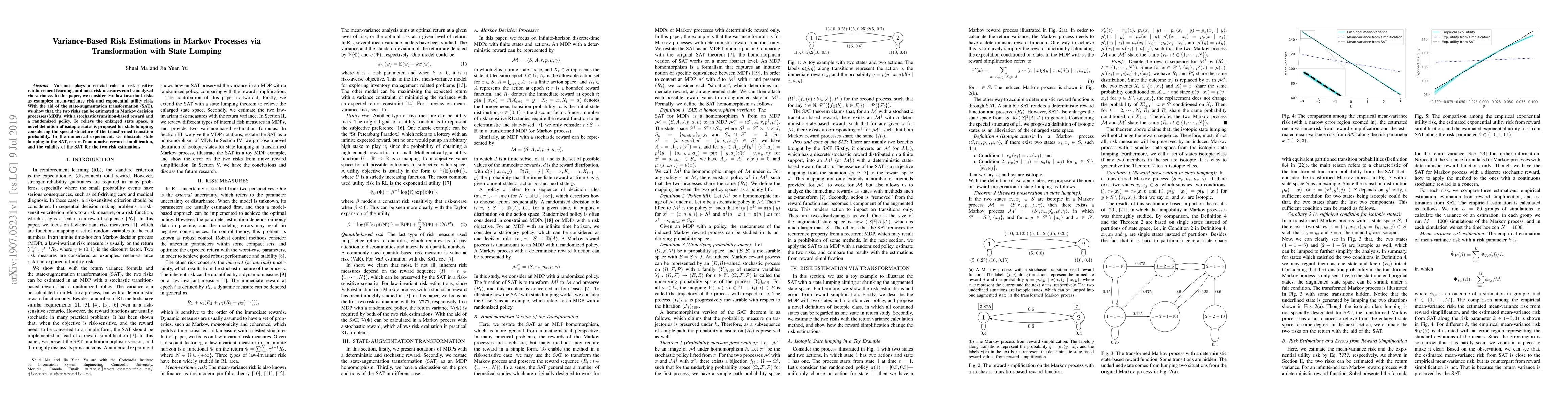 Variance plays a crucial role in risk-sensitive reinforcement learning, and most risk measures can be analyzed via variance. In this paper, we consider two law-invariant risks as examples: mean-variance risk and exponential utility risk. With the aid of the state-augmentation transformation (SAT), we show that, the two risks can be estimated in Markov decision processes (MDPs) with a stochastic transition-based reward and a randomized policy. To relieve the enlarged state space, a novel definition of isotopic states is proposed for state lumping, considering the special structure of the transformed transition probability. In the numerical experiment, we illustrate state lumping in the SAT, errors from a naive reward simplification, and the validity of the SAT for the two risk estimations.