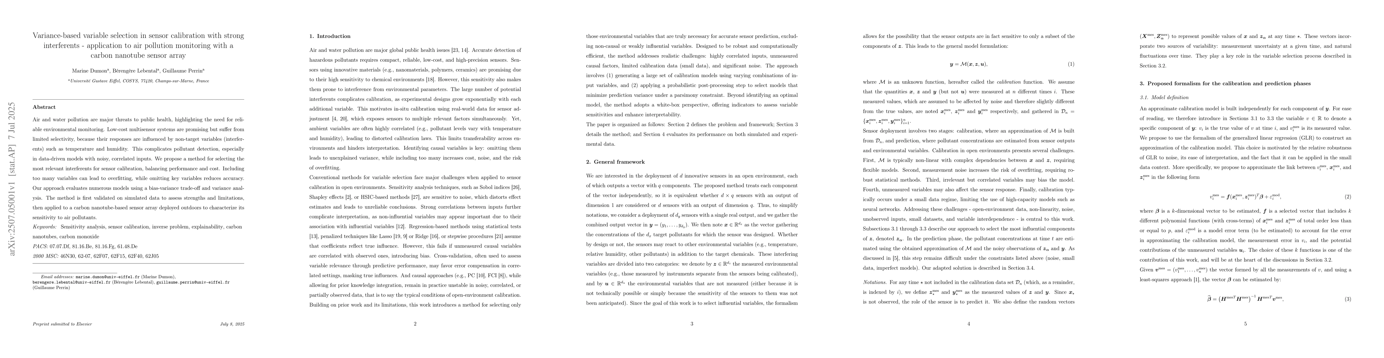 Air and water pollution are major threats to public health, highlighting the need for reliable environmental monitoring. Low-cost multisensor systems are promising but suffer from limited selectivity, because their responses are influenced by non-target variables (interferents) such as temperature and humidity. This complicates pollutant detection, especially in data-driven models with noisy, correlated inputs. We propose a method for selecting the most relevant interferents for sensor calibration, balancing performance and cost. Including too many variables can lead to overfitting, while omitting key variables reduces accuracy. Our approach evaluates numerous models using a bias-variance trade-off and variance analysis. The method is first validated on simulated data to assess strengths and limitations, then applied to a carbon nanotube-based sensor array deployed outdoors to characterize its sensitivity to air pollutants.