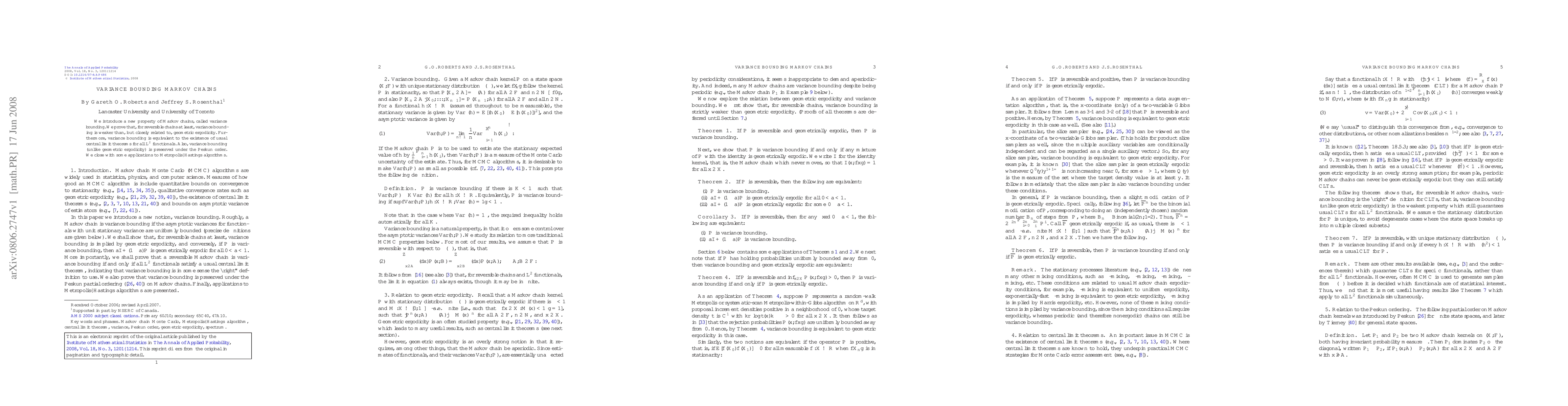 This paper introduces "variance bounding," a new property for Markov chains, showing its equivalence to central limit theorems for $L^2$ functionals and its preservation under the Peskun order, while being weaker than geometric ergodicity. Applications to Metropolis-Hastings algorithms are also discussed.