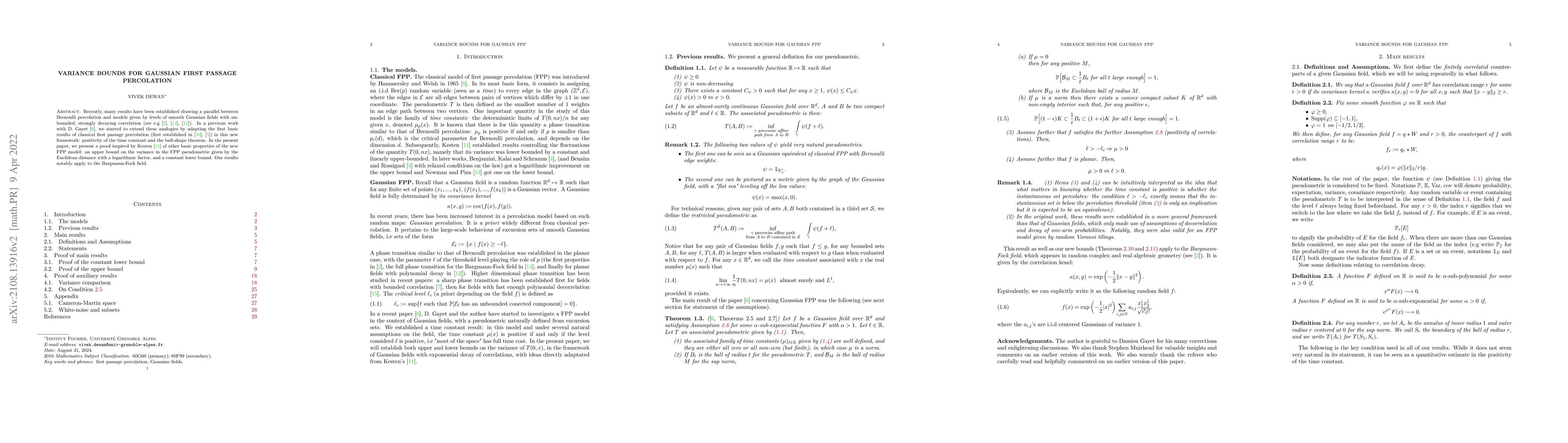 This paper extends classical first passage percolation results to Gaussian fields, proving an upper bound on the variance of the FPP pseudometric with a logarithmic factor and establishing a constant lower bound, thereby applying these findings to the Bargmann-Fock field.