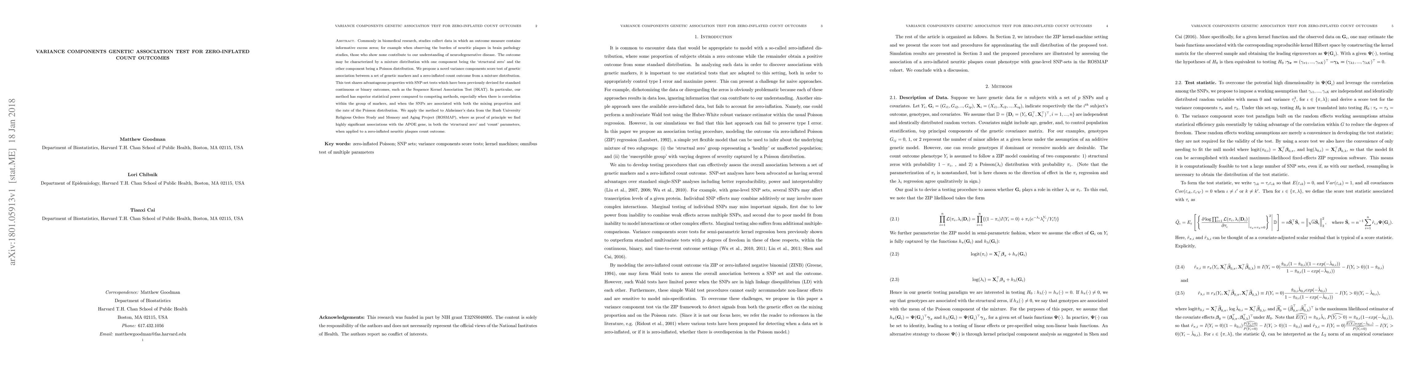 This paper introduces a novel variance components score test for genetic association with zero-inflated count outcomes, demonstrating superior statistical power compared to existing methods. The method is applied to Alzheimer's data, revealing significant associations with the APOE gene.