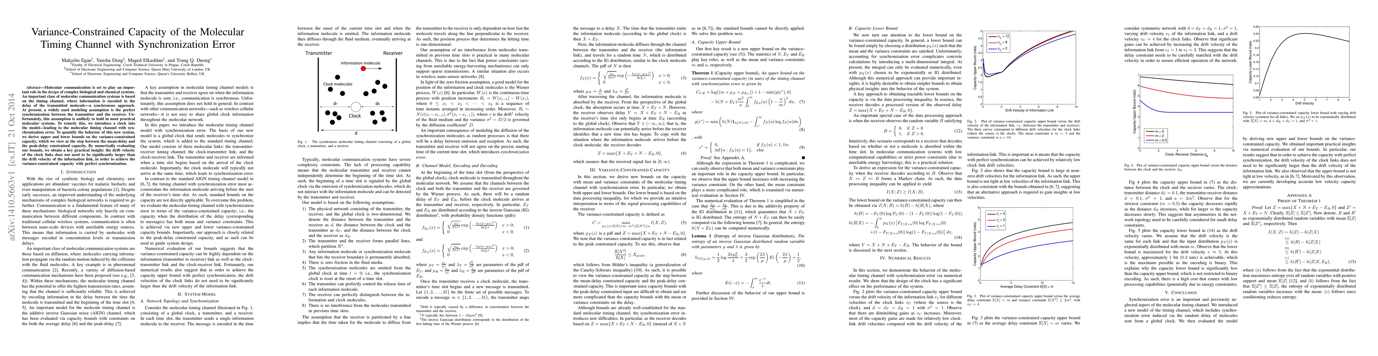 This paper investigates the variance-constrained capacity of molecular timing channels with synchronization errors, deriving upper and lower bounds to quantify the system's behavior. It reveals that achieving variance-constrained capacity with synchronization does not require the drift velocity of clock links to be significantly greater than that of the information link.