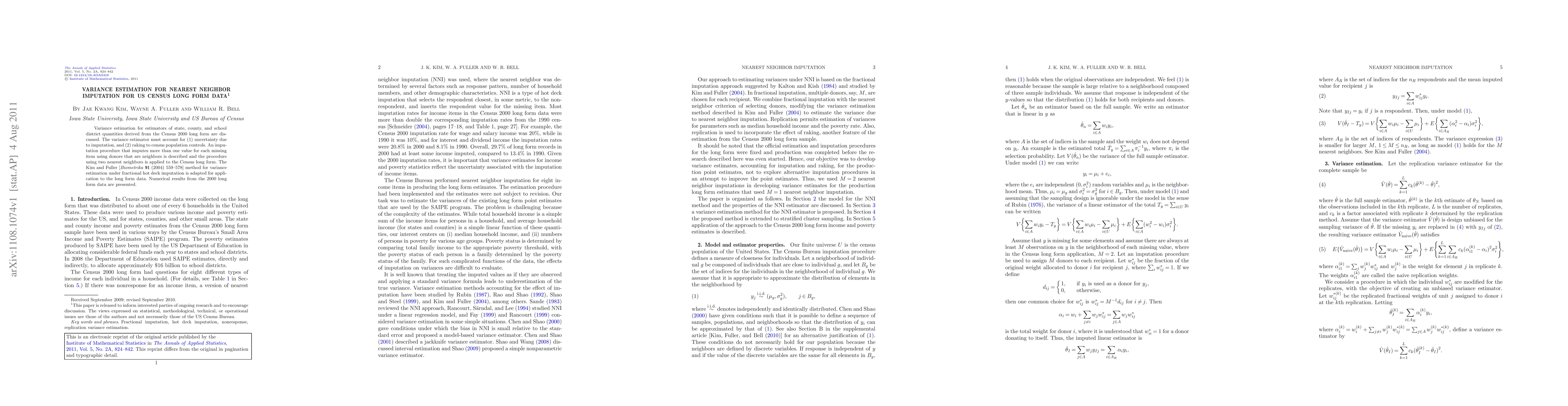 This paper discusses variance estimation for state, county, and school district quantities derived from Census 2000 long form data using nearest neighbor imputation. It adapts the Kim and Fuller method for variance estimation under fractional hot deck imputation to account for imputation and raking adjustments, and presents numerical results from the 2000 long form data.
