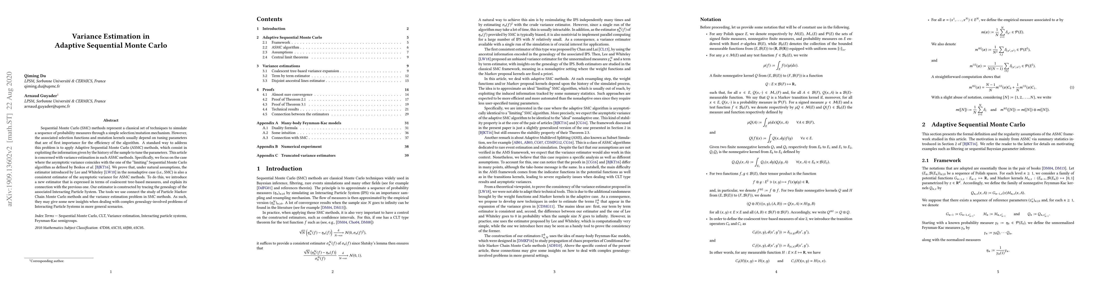 This paper investigates variance estimation in Adaptive Sequential Monte Carlo (ASMC) methods, proving that the estimator introduced by Lee and Whiteley for nonadaptive SMC remains consistent for ASMC. It proposes a new coalescent tree-based estimator linked to the genealogy of the Interacting Particle System, offering insights into the variance estimation problem in complex systems.
