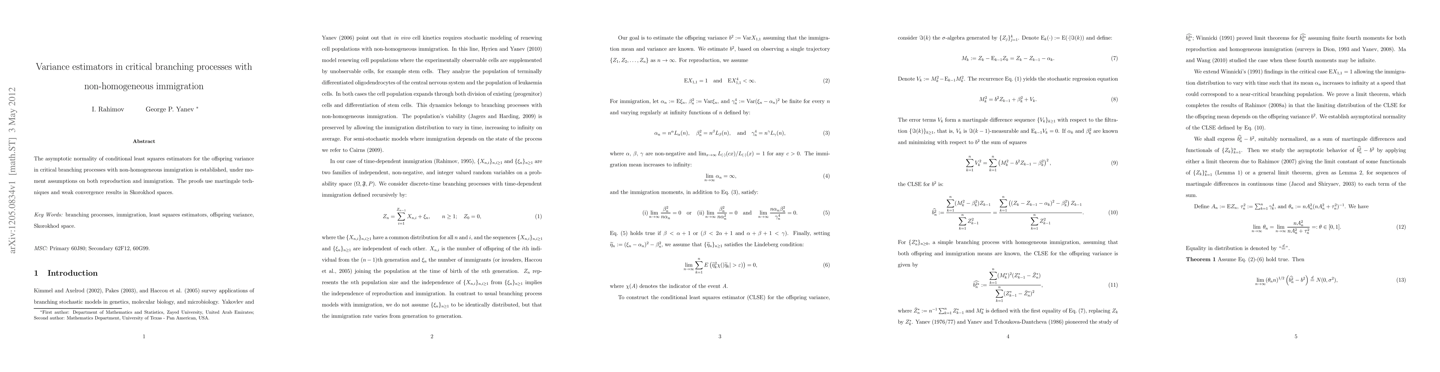 This paper establishes the asymptotic normality of conditional least squares estimators for offspring variance in critical branching processes with non-homogeneous immigration, utilizing martingale techniques and weak convergence results in Skorokhod spaces under moment assumptions on reproduction and immigration.