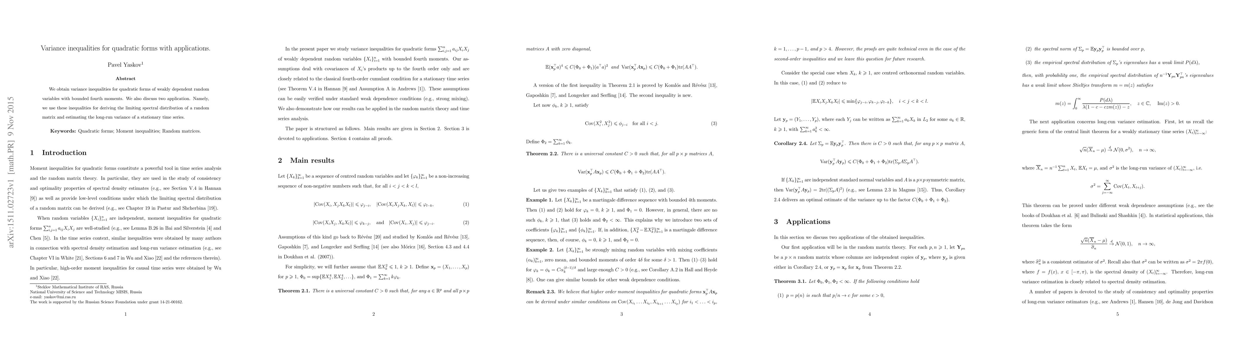 Summary: This paper establishes variance inequalities for quadratic forms of weakly dependent random variables, applying these results to derive the limiting spectral distribution of random matrices and to estimate the long-run variance of stationary time series.