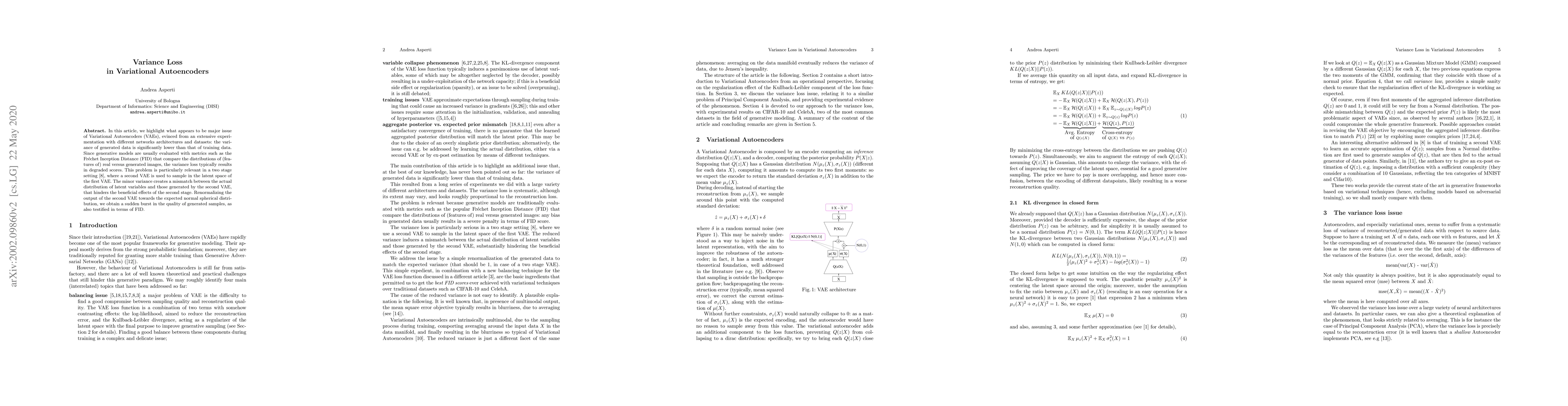 In this article, we highlight what appears to be major issue of Variational Autoencoders, evinced from an extensive experimentation with different network architectures and datasets: the variance of generated data is significantly lower than that of training data. Since generative models are usually evaluated with metrics such as the Frechet Inception Distance (FID) that compare the distributions of (features of) real versus generated images, the variance loss typically results in degraded scores. This problem is particularly relevant in a two stage setting, where we use a second VAE to sample in the latent space of the first VAE. The minor variance creates a mismatch between the actual distribution of latent variables and those generated by the second VAE, that hinders the beneficial effects of the second stage. Renormalizing the output of the second VAE towards the expected normal spherical distribution, we obtain a sudden burst in the quality of generated samples, as also testified in terms of FID.