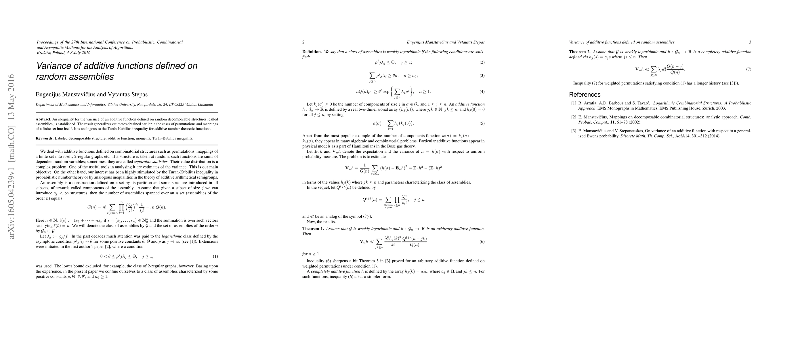 An inequality for the variance of an additive function defined on random decomposable structures, called assemblies, is established. The result generalizes estimates obtained earlier in the cases of permutations and mappings of a finite set into itself. It is analogous to the Tur\'an-Kubilius inequality for additive number-theoretic functions.