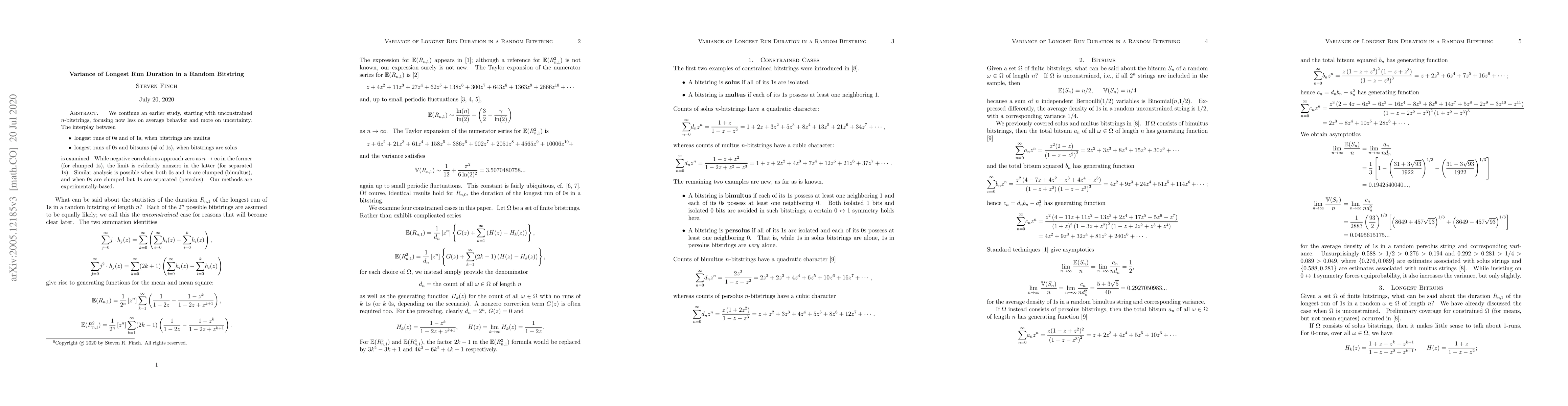 We continue an earlier study, starting with unconstrained $n$-bitstrings, focusing now less on average behavior and more on uncertainty. The interplay between $\bullet$ longest runs of 0s and of 1s, when bitstrings are multus $\bullet$ longest runs of 0s and bitsums (# of 1s), when bitstrings are solus $\\$ is examined. While negative correlations approach zero as $n \rightarrow \infty$ in the former (for clumped 1s), the limit is evidently nonzero in the latter (for separated 1s). Similar analysis is possible when both 0s and 1s are clumped (bimultus), and when 0s are clumped but 1s are separated (persolus). Our methods are experimentally-based.