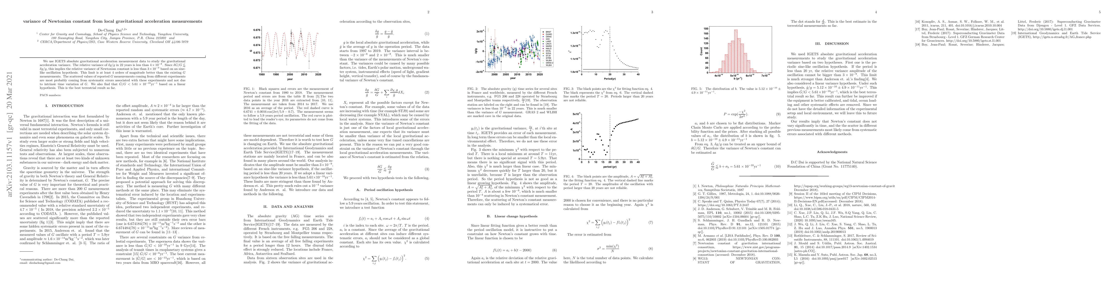 We use IGETS absolute gravitational acceleration measurement data to study the gravitational acceleration variance. The relative variance of $\delta g /g$ in 22 years is less than $4\times 10^{-8}$. Since $\delta G /G\lessapprox\delta g /g $, this implies the relative variance of Newtonian constant is less than $3\times 10^{-9}$ based on an sine-like oscillation hypothesis. This limit is at least 4 orders of magnitude better than the existing $G$ measurements. The scattered values of reported $G$ measurements coming from different experiments are most probably coming from systematic errors associated with these experiments and not due to intrinsic time variation of $G$. We also find that $\dot{ G} /G<5.61\times 10^{-10} \text{yr}^{-1}$ based on a linear hypothesis. This is the best terrestrial result so far.