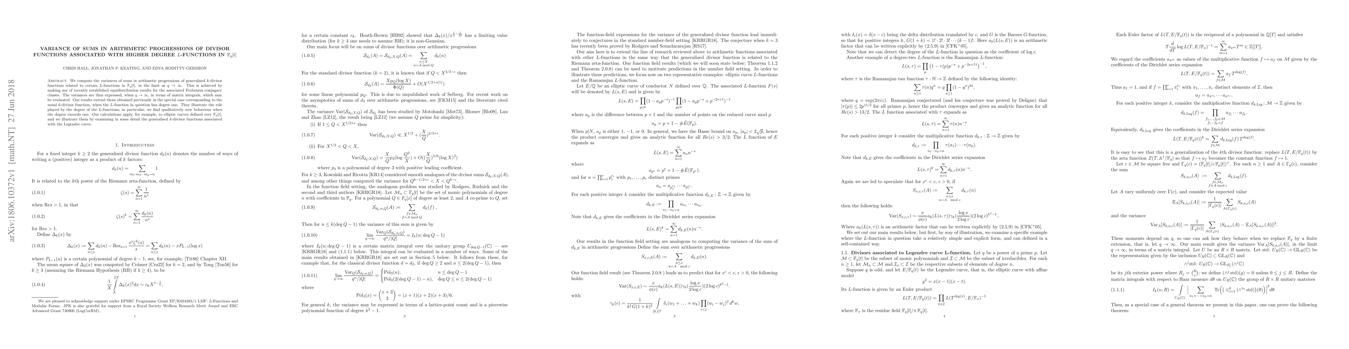 We compute the variances of sums in arithmetic progressions of generalised k-divisor functions related to certain L-functions in $\mathbb{F}_q(t)$, in the limit as $q\to\infty$. This is achieved by making use of recently established equidistribution results for the associated Frobenius conjugacy classes. The variances are thus expressed, when $q\to\infty$, in terms of matrix integrals, which may be evaluated. Our results extend those obtained previously in the special case corresponding to the usual $k$-divisor function, when the L-function in question has degree one. They illustrate the role played by the degree of the L-functions; in particular, we find qualitatively new behaviour when the degree exceeds one. Our calculations apply, for example, to elliptic curves defined over $\mathbb{F}_q(t)$, and we illustrate them by examining in some detail the generalised $k$-divisor functions associated with the Legendre curve.