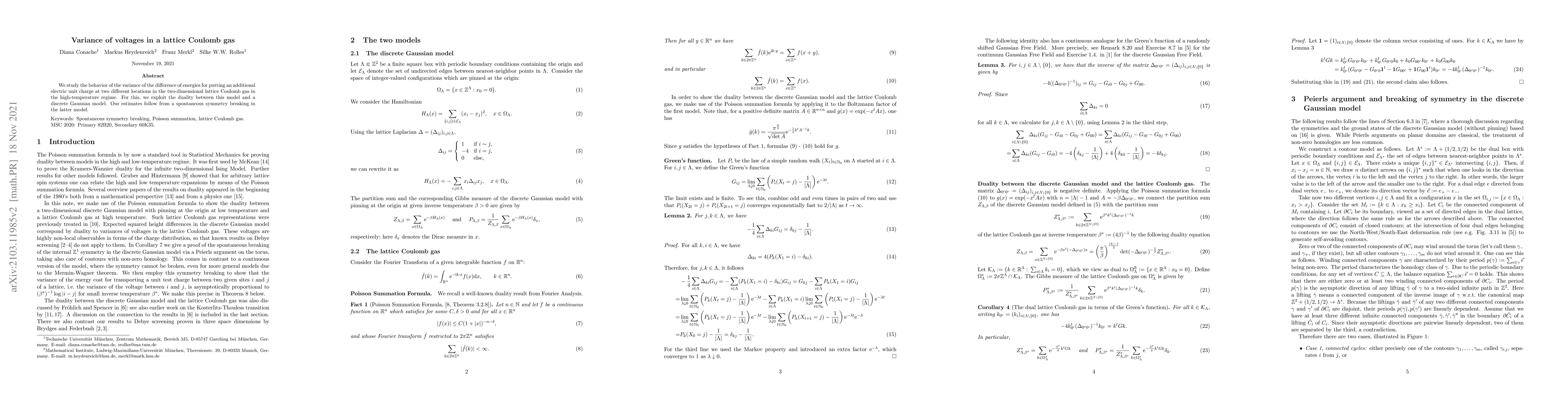 We study the behavior of the variance of the difference of energies for putting an additional electric unit charge at two different locations in the two-dimensional lattice Coulomb gas in the high-temperature regime. For this, we exploit the duality between this model and a discrete Gaussian model. Our estimates follow from a spontaneous symmetry breaking in the latter model.
