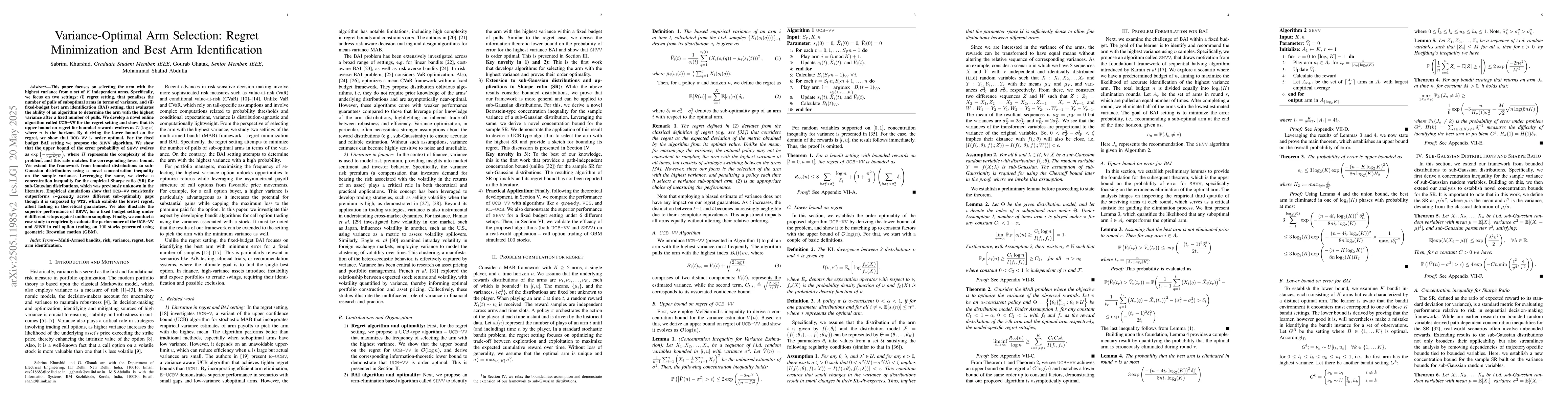 This paper focuses on selecting the arm with the highest variance from a set of $K$ independent arms. Specifically, we focus on two settings: (i) regret setting, that penalizes the number of pulls of suboptimal arms in terms of variance, and (ii) fixed-budget BAI setting, that evaluates the ability of an algorithm to determine the arm with the highest variance after a fixed number of pulls. We develop a novel online algorithm called \texttt{UCB-VV} for the regret setting and show that its upper bound on regret for bounded rewards evolves as $\mathcal{O}\left(\log{n}\right)$ where $n$ is the horizon. By deriving the lower bound on the regret, we show that \texttt{UCB-VV} is order optimal. For the fixed budget BAI setting, we propose the \texttt{SHVV} algorithm. We show that the upper bound of the error probability of \texttt{SHVV} evolves as $\exp\left(-\frac{n}{\log(K) H}\right)$, where $H$ represents the complexity of the problem, and this rate matches the corresponding lower bound. We extend the framework from bounded distributions to sub-Gaussian distributions using a novel concentration inequality on the sample variance. Leveraging the same, we derive a concentration inequality for the empirical Sharpe ratio (SR) for sub-Gaussian distributions, which was previously unknown in the literature. Empirical simulations show that \texttt{UCB-VV} consistently outperforms \texttt{$\epsilon$-greedy} across different sub-optimality gaps, though it is surpassed by \texttt{VTS}, which exhibits the lowest regret, albeit lacking in theoretical guarantees. We also illustrate the superior performance of \texttt{SHVV}, for a fixed budget setting under 6 different setups against uniform sampling. Finally, we conduct a case study to empirically evaluate the performance of the \texttt{UCB-VV} and \texttt{SHVV} in call option trading on $100$ stocks generated using geometric Brownian motion (GBM).