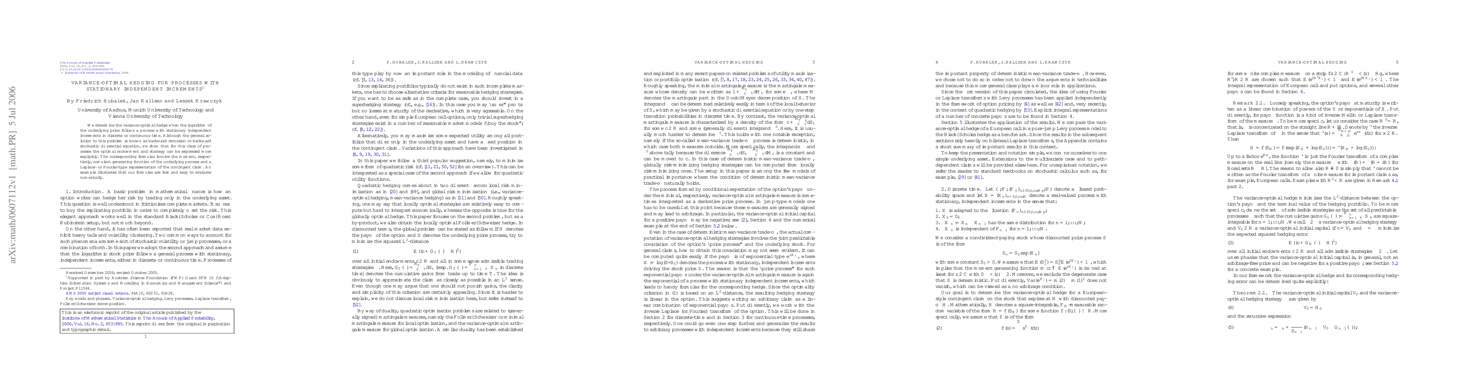 Researchers find that variance-optimal hedging for processes with stationary independent increments can be expressed explicitly using moment and cumulant generating functions of the underlying process.
