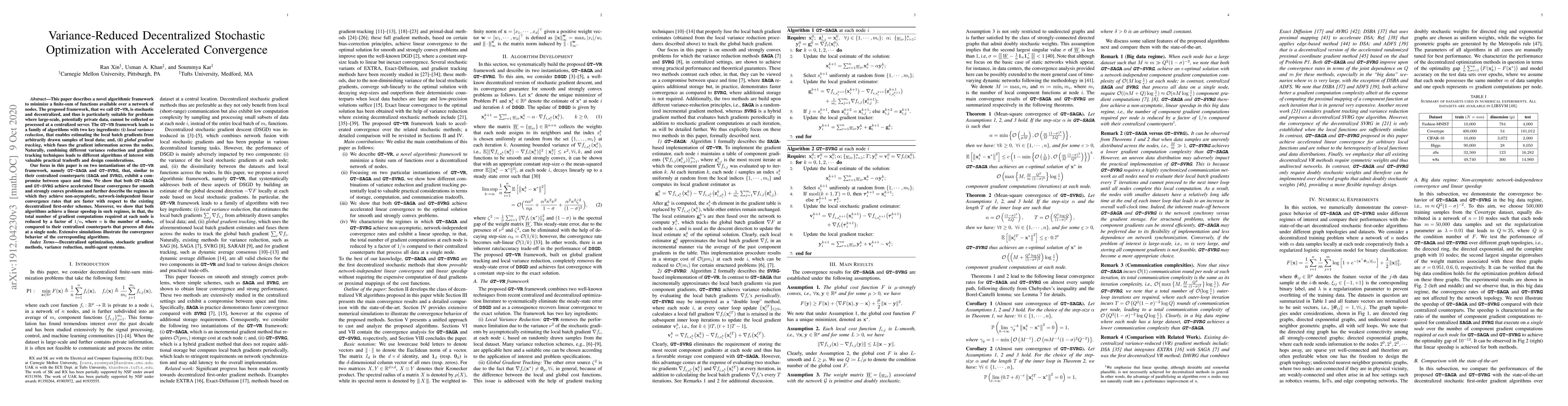 This paper introduces a decentralized stochastic optimization framework, \GTVR, that uses local variance reduction and global gradient tracking to achieve accelerated convergence for large-scale, distributed optimization problems. The proposed algorithms, GT-SAGA and GT-SVRG, demonstrate faster convergence rates compared to existing decentralized first-order methods, with a linear speedup in gradient computations.
