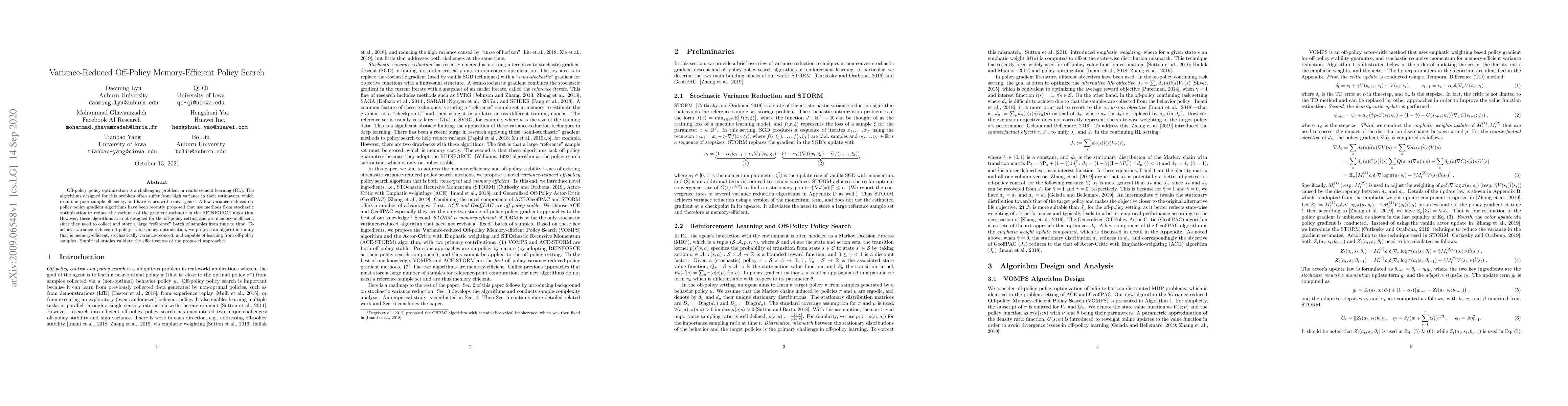This paper proposes a new memory-efficient algorithm family for variance-reduced off-policy policy optimization in reinforcement learning, addressing high variance and convergence issues in existing methods. Empirical results demonstrate the effectiveness of the proposed approaches.