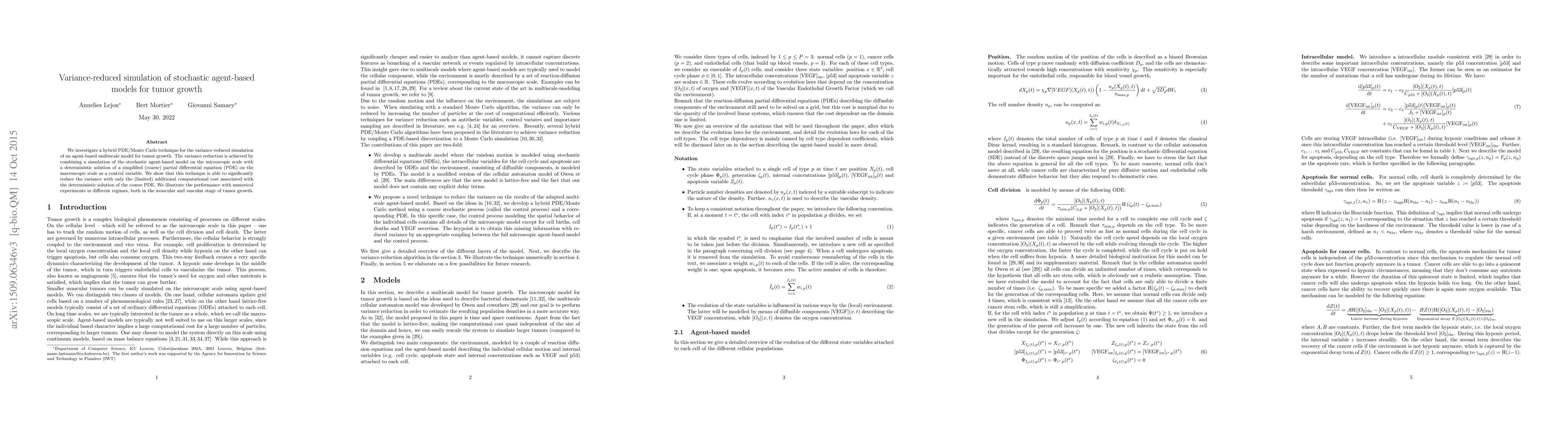 This paper proposes a hybrid PDE/Monte Carlo method to reduce variance in simulations of stochastic agent-based models for tumor growth. The technique combines microscopic stochastic simulations with macroscopic deterministic PDE solutions, significantly lowering variance with minimal extra computational cost.