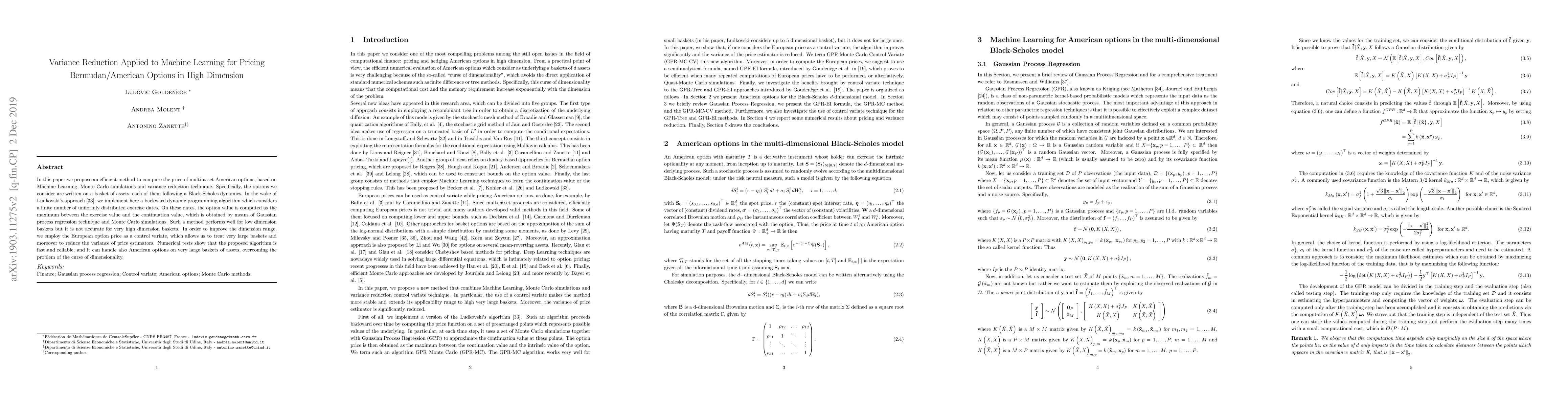 This paper proposes a machine learning-based method combining Monte Carlo simulations and variance reduction to efficiently price multi-asset American options. It employs Gaussian process regression and a control variate to enhance accuracy for high-dimensional baskets, demonstrating improved performance over traditional methods.