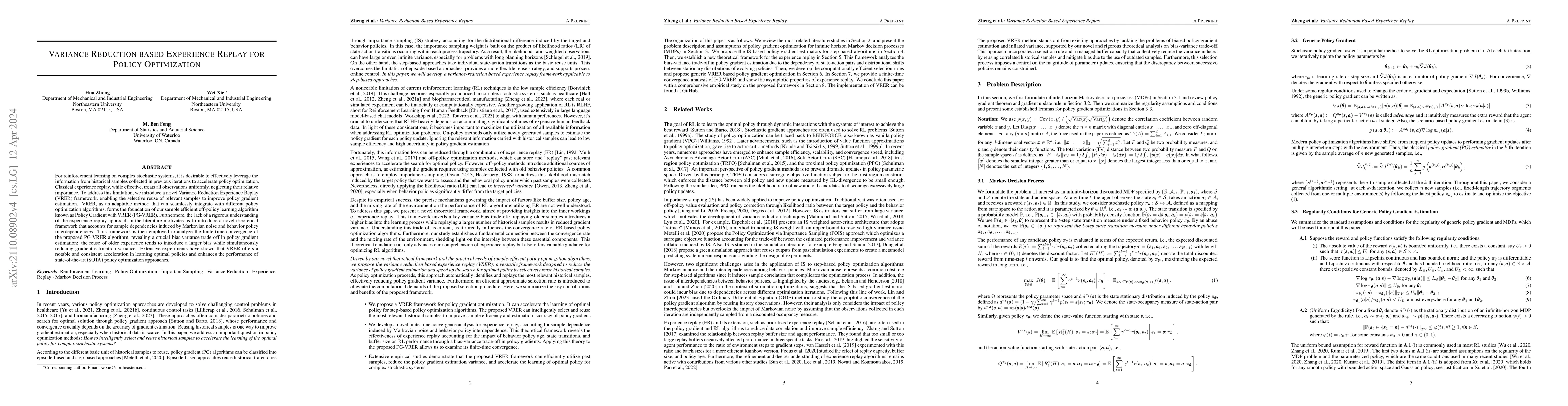 For reinforcement learning on complex stochastic systems, it is desirable to effectively leverage the information from historical samples collected in previous iterations to accelerate policy optimization. Classical experience replay, while effective, treats all observations uniformly, neglecting their relative importance. To address this limitation, we introduce a novel Variance Reduction Experience Replay (VRER) framework, enabling the selective reuse of relevant samples to improve policy gradient estimation. VRER, as an adaptable method that can seamlessly integrate with different policy optimization algorithms, forms the foundation of our sample efficient off-policy learning algorithm known as Policy Gradient with VRER (PG-VRER). Furthermore, the lack of a rigorous understanding of the experience replay approach in the literature motivates us to introduce a novel theoretical framework that accounts for sample dependencies induced by Markovian noise and behavior policy interdependencies. This framework is then employed to analyze the finite-time convergence of the proposed PG-VRER algorithm, revealing a crucial bias-variance trade-off in policy gradient estimation: the reuse of older experience tends to introduce a larger bias while simultaneously reducing gradient estimation variance. Extensive experiments have shown that VRER offers a notable and consistent acceleration in learning optimal policies and enhances the performance of state-of-the-art (SOTA) policy optimization approaches.