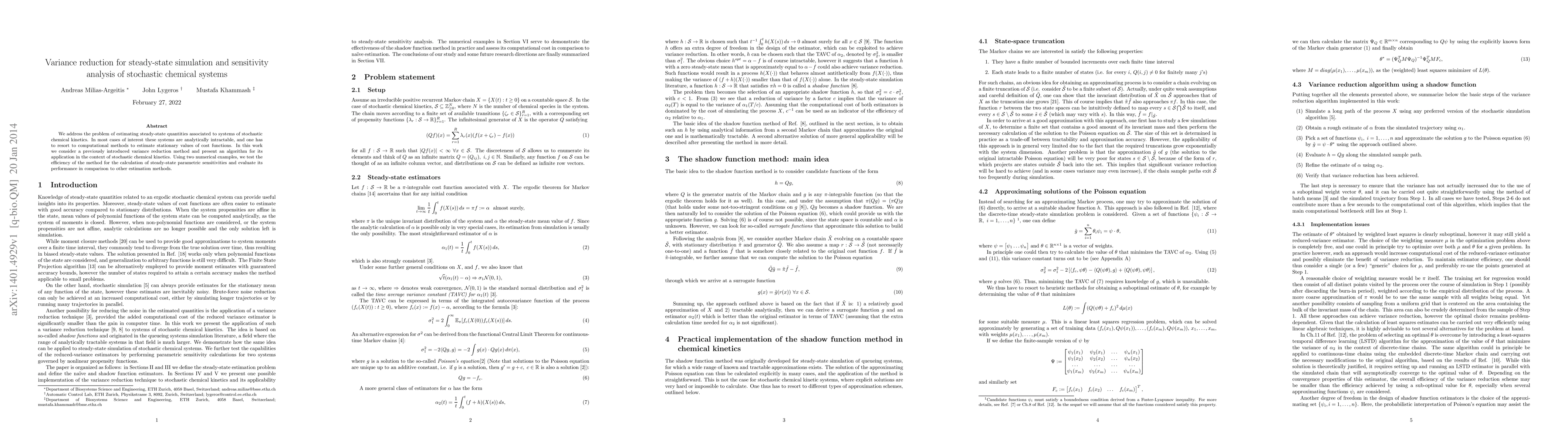 This paper proposes an algorithm for applying a variance reduction method to estimate steady-state quantities in analytically intractable stochastic chemical systems. The method is tested for efficiency in calculating steady-state parametric sensitivities and compared to other estimation techniques using numerical examples.