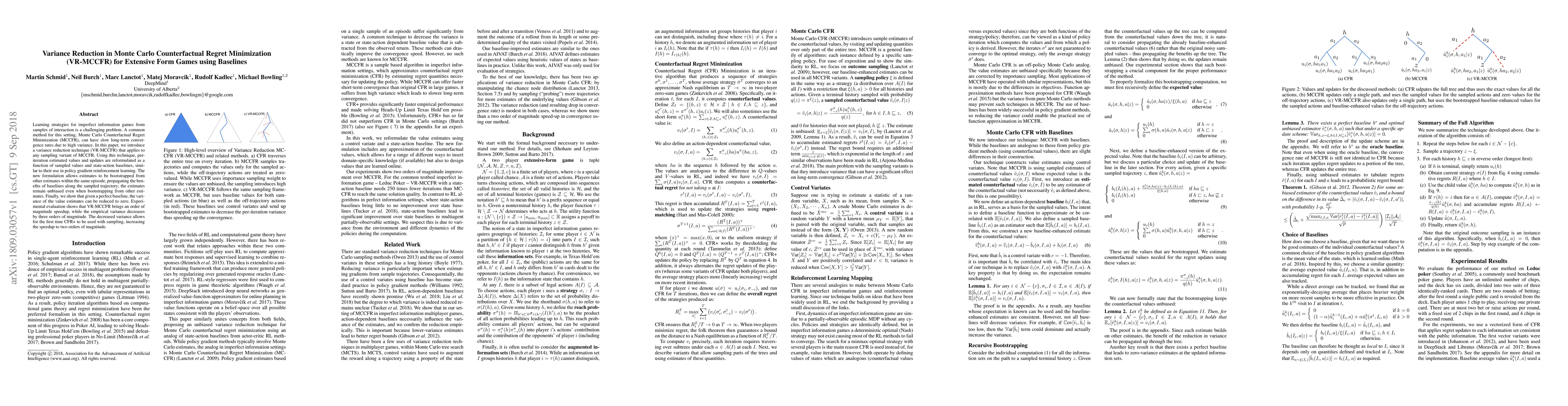 This paper introduces a variance reduction technique (VR-MCCFR) for Monte Carlo Counterfactual Regret Minimization in extensive form games, reformulating estimates using state-action baselines to significantly speed up convergence. Experimental results show an order of magnitude speedup and a three-order decrease in empirical variance.