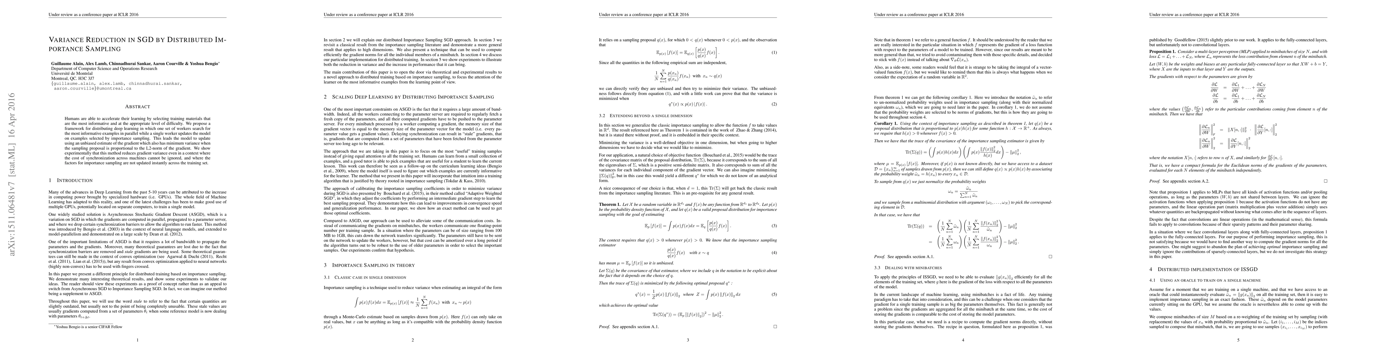 This paper proposes a distributed deep learning framework using importance sampling to reduce variance in stochastic gradient descent (SGD). By parallelizing the search for informative training examples and employing importance sampling for model updates, the method achieves an unbiased gradient estimate with minimal variance, leading to effective variance reduction in SGD.