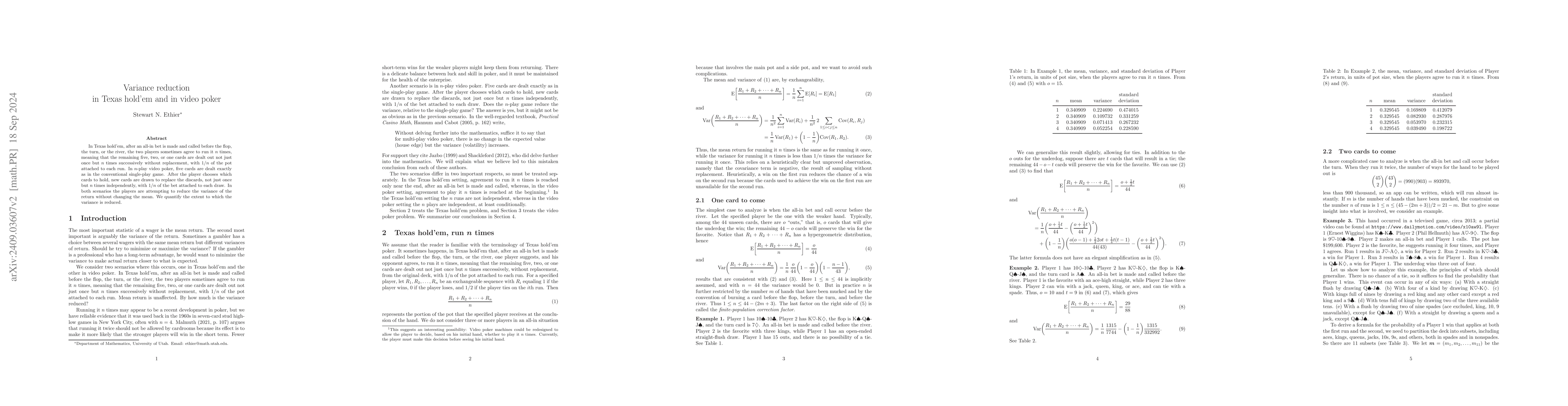In Texas hold'em, after an all-in bet is made and called before the flop, the turn, or the river, the two players sometimes agree to run it $n$ times, meaning that the remaining five, two, or one cards are dealt out not just once but $n$ times successively without replacement, with $1/n$ of the pot attached to each run. In $n$-play video poker, five cards are dealt exactly as in the conventional single-play game. After the player chooses which cards to hold, new cards are drawn to replace the discards, not just once but $n$ times independently, with $1/n$ of the bet attached to each draw. In both scenarios the players are attempting to reduce the variance of the return without changing the mean. We quantify the extent to which the variance is reduced.
