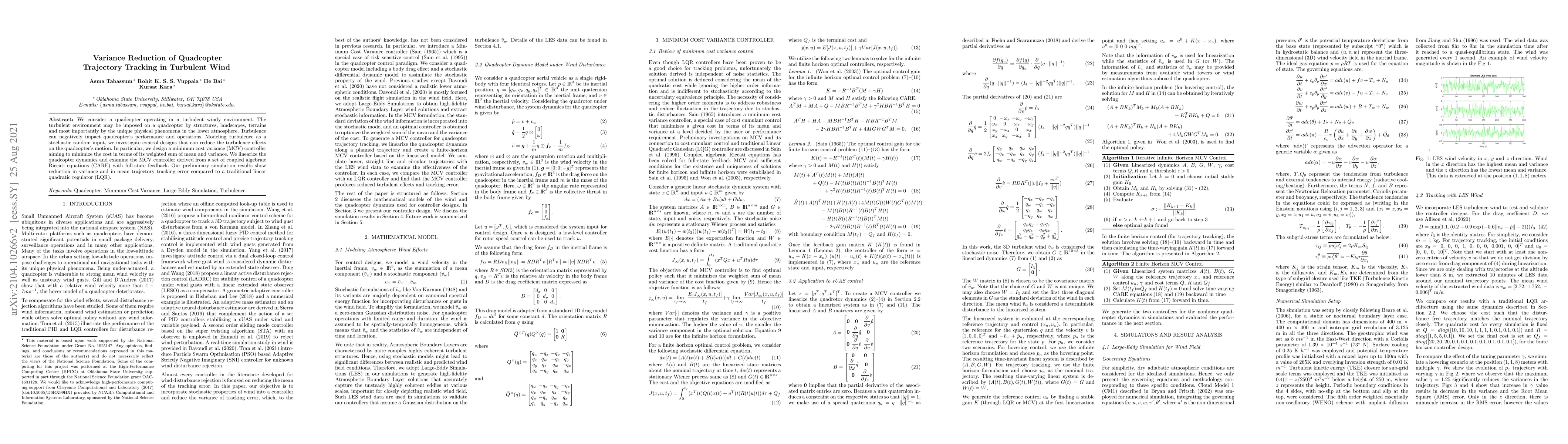 We consider a quadcopter operating in a turbulent windy environment. The turbulent environment may be imposed on a quadcopter by structures, landscapes, terrains and most importantly by the unique physical phenomena in the lower atmosphere. Turbulence can negatively impact quadcopter's performance and operations. Modeling turbulence as a stochastic random input, we investigate control designs that can reduce the turbulence effects on the quadcopter's motion. In particular, we design a minimum cost variance (MCV) controller aiming to minimize the cost in terms of its weighted sum of mean and variance. We linearize the quadcopter dynamics and examine the MCV controller derived from a set of coupled algebraic Riccati equations (CARE) with full-state feedback. Our preliminary simulation results show reduction in variance and in mean trajectory tracking error compared to a traditional linear quadratic regulator (LQR).