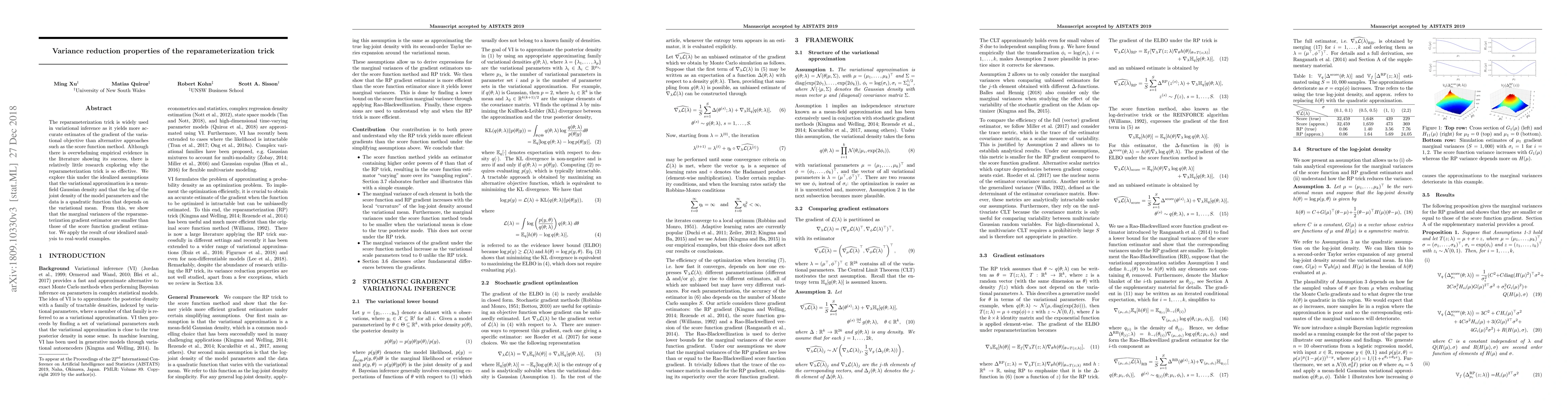 The reparameterization trick provides more accurate gradient estimates in variational inference compared to the score function method. Under idealized assumptions, we demonstrate that it reduces the marginal variances of the gradient estimator, explaining its effectiveness.