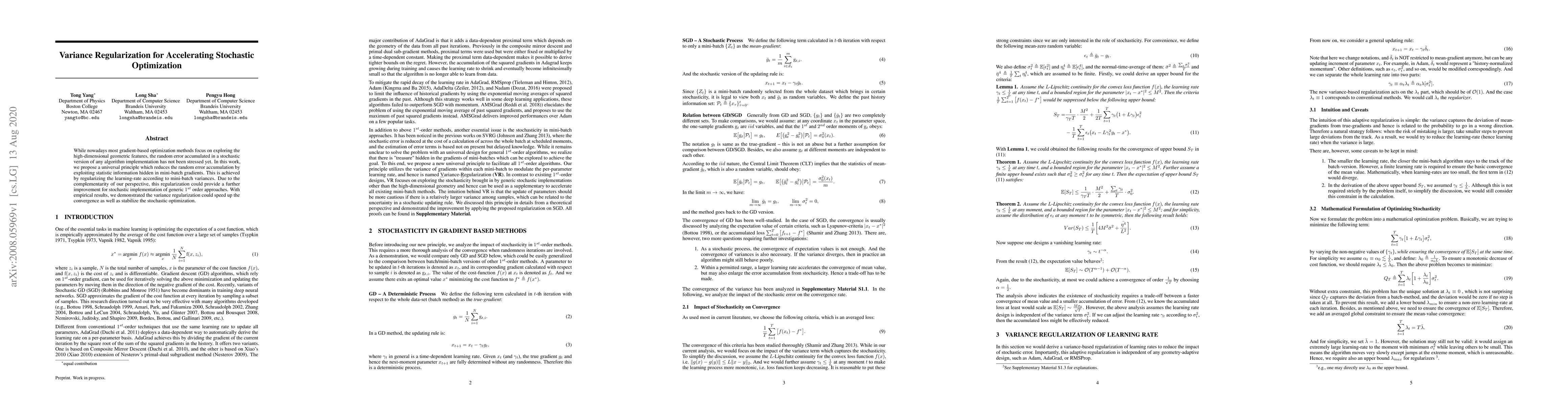 While nowadays most gradient-based optimization methods focus on exploring the high-dimensional geometric features, the random error accumulated in a stochastic version of any algorithm implementation has not been stressed yet. In this work, we propose a universal principle which reduces the random error accumulation by exploiting statistic information hidden in mini-batch gradients. This is achieved by regularizing the learning-rate according to mini-batch variances. Due to the complementarity of our perspective, this regularization could provide a further improvement for stochastic implementation of generic 1st order approaches. With empirical results, we demonstrated the variance regularization could speed up the convergence as well as stabilize the stochastic optimization.