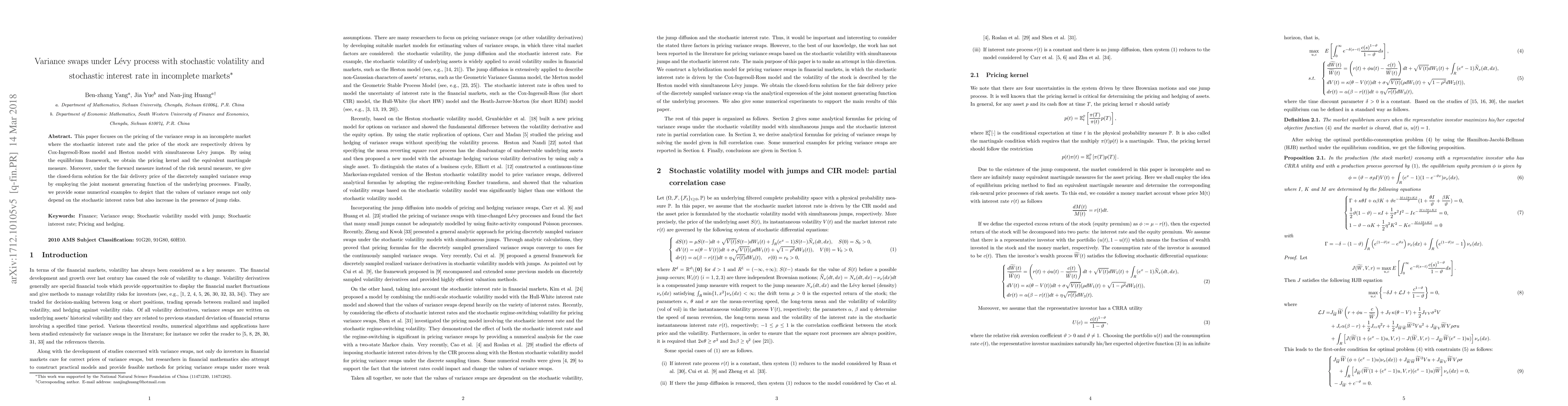 This paper focuses on the pricing of the variance swap in an incomplete market where the stochastic interest rate and the price of the stock are respectively driven by Cox-Ingersoll-Ross model and Heston model with simultaneous L\'{e}vy jumps. By using the equilibrium framework, we obtain the pricing kernel and the equivalent martingale measure. Moreover, under the forward measure instead of the risk neural measure, we give the closed-form solution for the fair delivery price of the discretely sampled variance swap by employing the joint moment generating function of the underlying processes. Finally, we provide some numerical examples to depict that the values of variance swaps not only depend on the stochastic interest rates but also increase in the presence of jump risks.