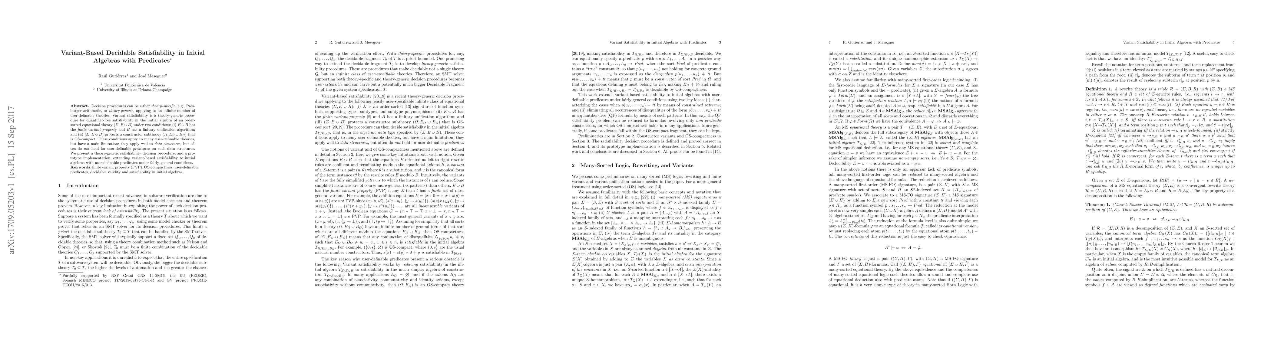 Decision procedures can be either theory-specific, e.g., Presburger arithmetic, or theory-generic, applying to an infinite number of user-definable theories. Variant satisfiability is a theory-generic procedure for quantifier-free satisfiability in the initial algebra of an order-sorted equational theory $({\Sigma},E \cup B)$ under two conditions: (i) $E \cup B$ has the finite variant property and $B$ has a finitary unification algorithm; and (ii) $({\Sigma},E \cup B)$ protects a constructor subtheory $({\Omega},E_{\Omega} \cup B_{\Omega})$ that is OS-compact. These conditions apply to many user-definable theories, but have a main limitation: they apply well to data structures, but often do not hold for user-definable predicates on such data structures. We present a theory-generic satisfiability decision procedure, and a prototype implementation, extending variant-based satisfiability to initial algebras with user-definable predicates under fairly general conditions.