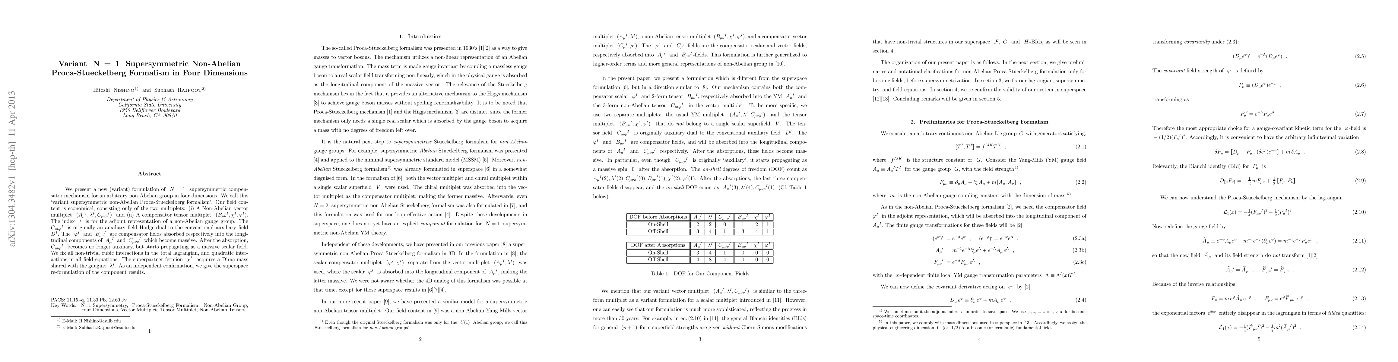 We present a new (variant) formulation of N=1 supersymmetric compensator mechanism for an arbitrary non-Abelian group in four dimensions. We call this `variant supersymmetric non-Abelian Proca-Stueckelberg formalism'. Our field content is economical, consisting only of the two multiplets: (i) A Non-Abelian vector multiplet (A_\mu{}^I, \lambda^I, C_{\mu\nu\rho}{}^I) and (ii) A compensator tensor multiplet (B_{\mu\nu}{}^I, \chi^I, \varphi^I). The index I is for the adjoint representation of a non-Abelian gauge group. The C_{\mu\nu\rho}{}^I is originally an auxiliary field Hodge-dual to the conventional auxiliary field D^I. The \varphi^I and B_{\mu\nu}{}^I are compensator fields absorbed respectively into the longitudinal components of A_\mu{}^I and C_{\mu\nu\rho}{}^I which become massive. After the absorption, C_{\mu\nu\rho}{}^I becomes no longer auxiliary, but starts propagating as a massive scalar field. We fix all non-trivial cubic interactions in the total lagrangian, and quadratic interactions in all field equations. The superpartner fermion \chi^I acquires a Dirac mass shared with the gaugino \lambda^I. As an independent confirmation, we give the superspace re-formulation of the component results.
