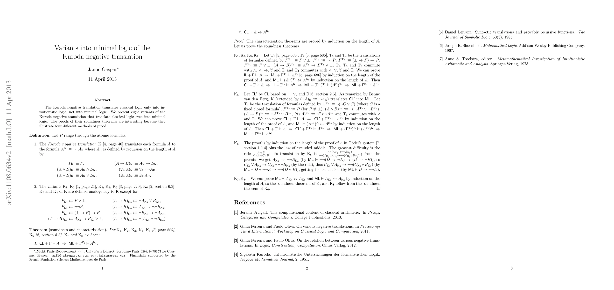 The Kuroda negative translation translates classical logic only into intuitionistic logic, not into minimal logic. We present eight variants of the Kuroda negative translation that translate classical logic even into minimal logic. The proofs of their soundness theorems are interesting because they illustrate four different methods of proof.