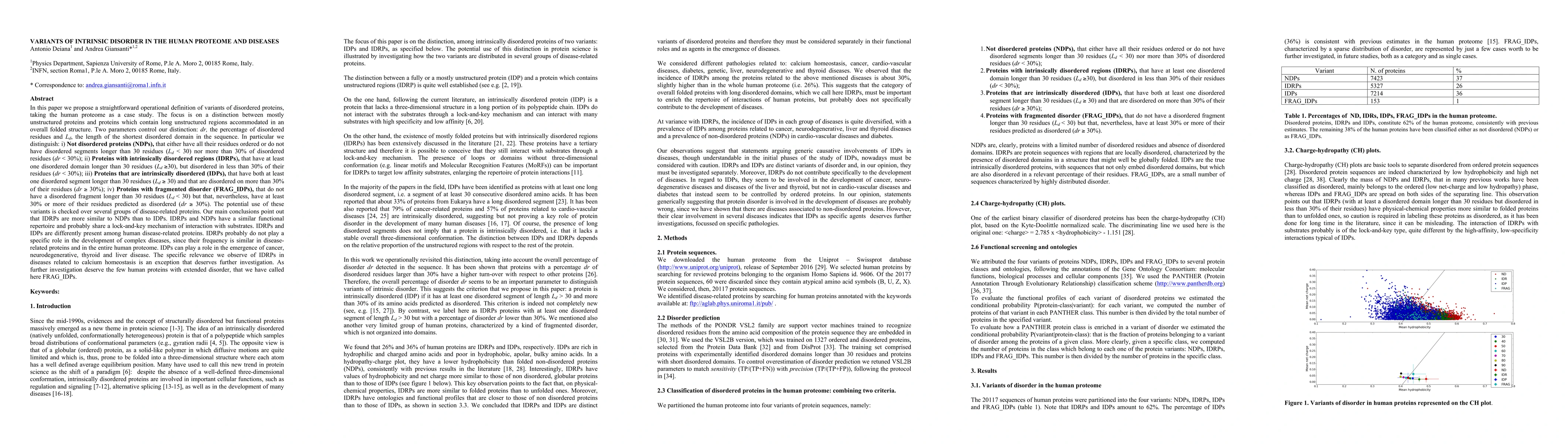 This paper categorizes variants of disordered proteins in the human proteome into four types: NDPs, IDRPs, IDPs, and FRAG_IDPs, based on their structural disorder. It reveals that IDRPs share functional similarities with NDPs and are less implicated in disease compared to IDPs, which are linked to various complex diseases.